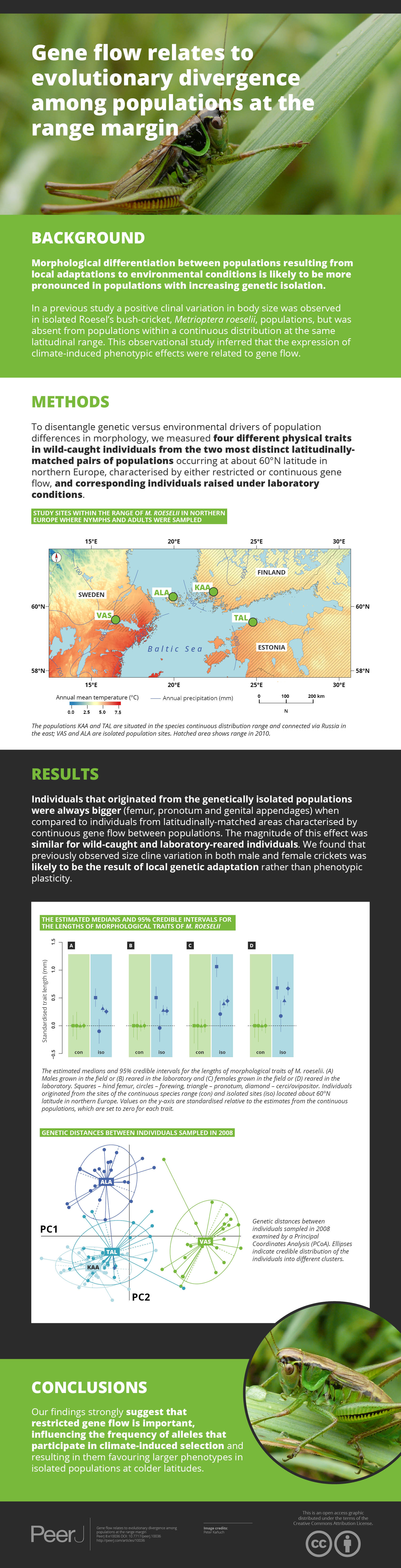 Controlled laboratory conditions revealed no evidence that phenotypic plasticity contributed significantly to the observed differences in three selected body traits (lengths of femur, pronotum and genital appendages) between genetically distinct populations of M. roeselii in northern Europe. While climate characteristics of latitudinally-matched pairs of populations (Fig. 1A) are similar, lack of ongoing gene flow into the isolated populations (Figs. 1B and 1C) is implicated as a cause of these patterns. Thus, our results are consistent with expectations based on a tension between gene flow (as a homogenising force) and divergent climate-related selection (as a diversifying force) that plays out differently in isolated versus continuous populations.