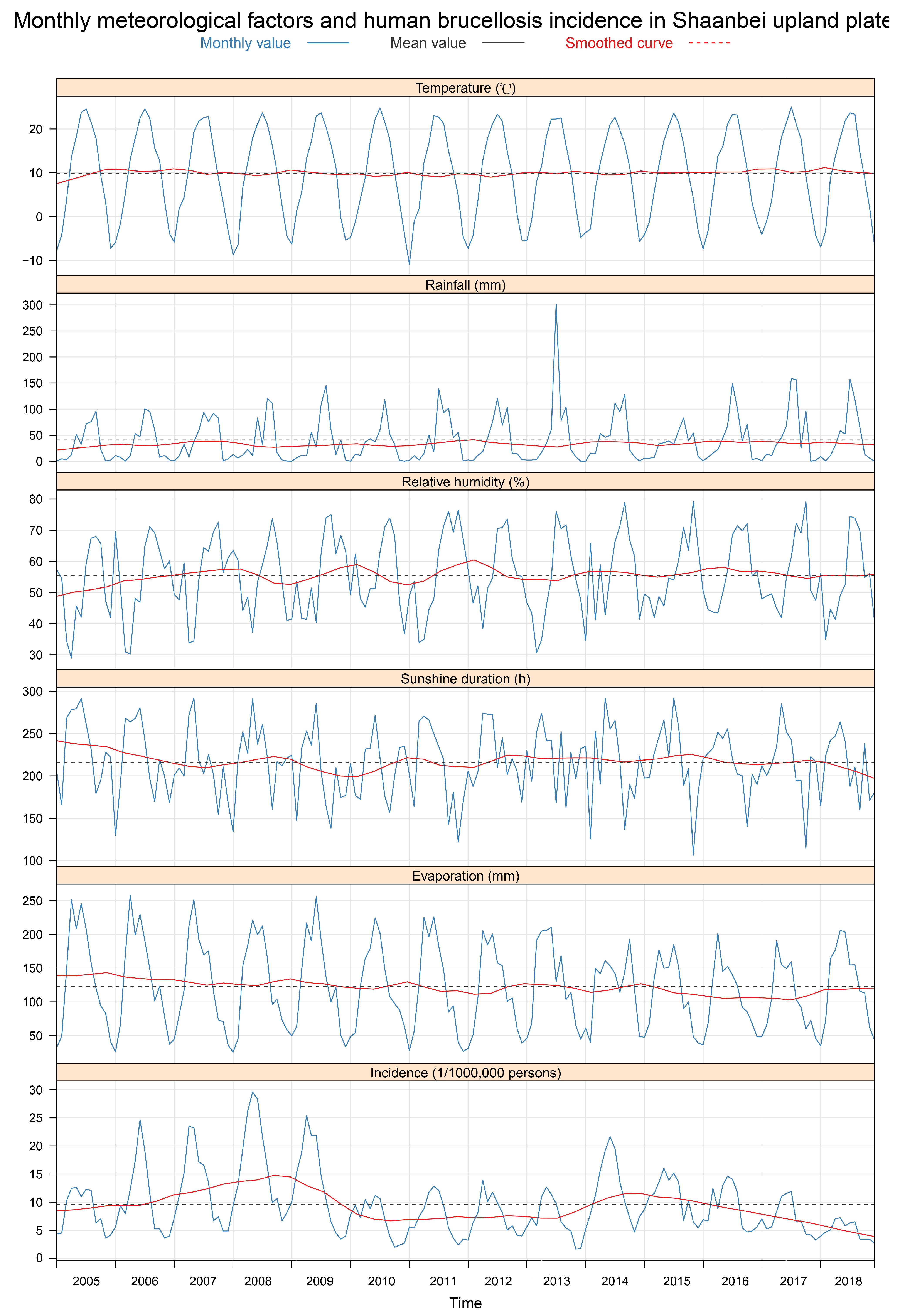 The time series distribution of monthly meteorological factors and human brucellosis in Shaanbei upland plateau