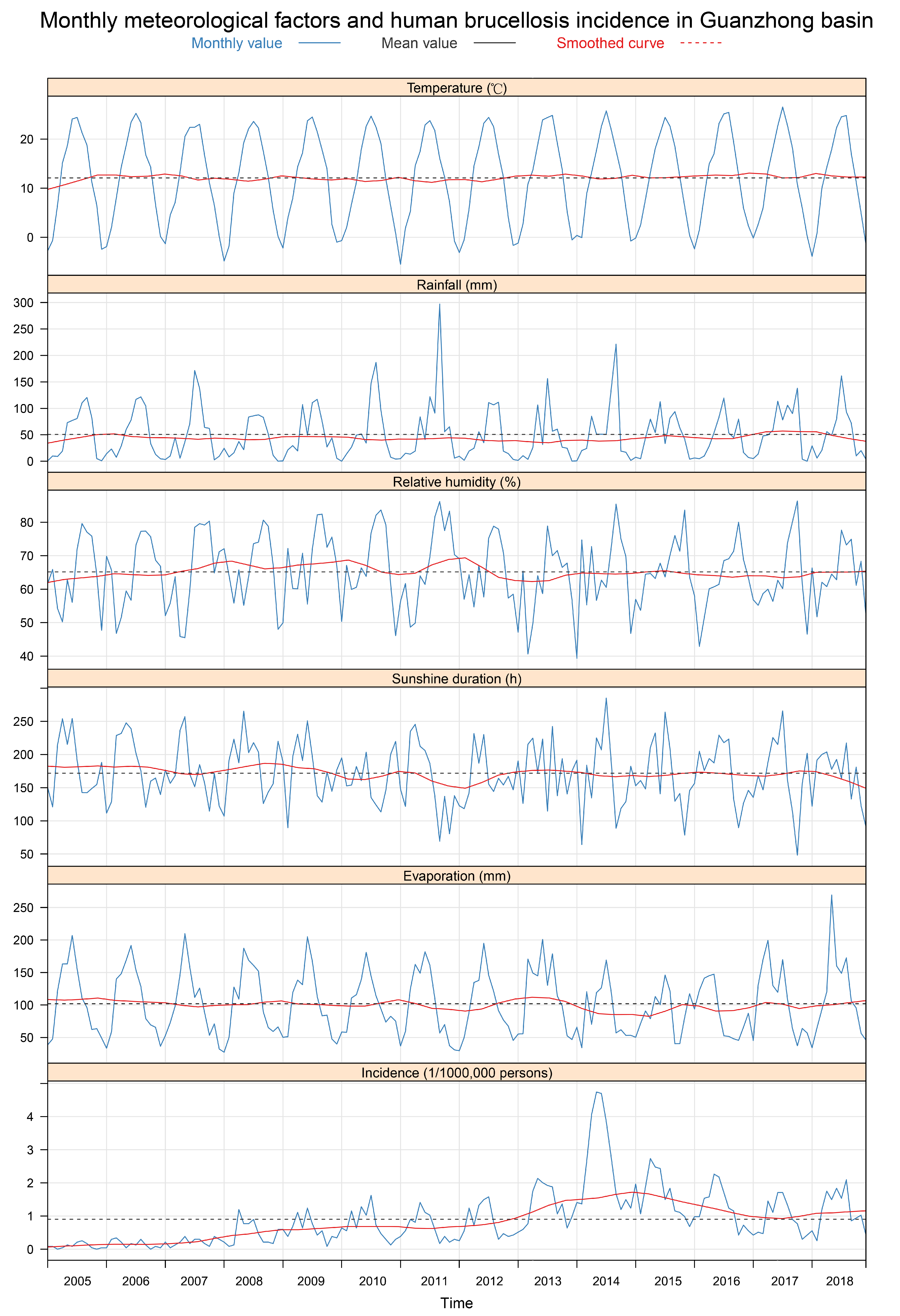 The time series distribution of monthly meteorological factors and human brucellosis in Guanzhong basin