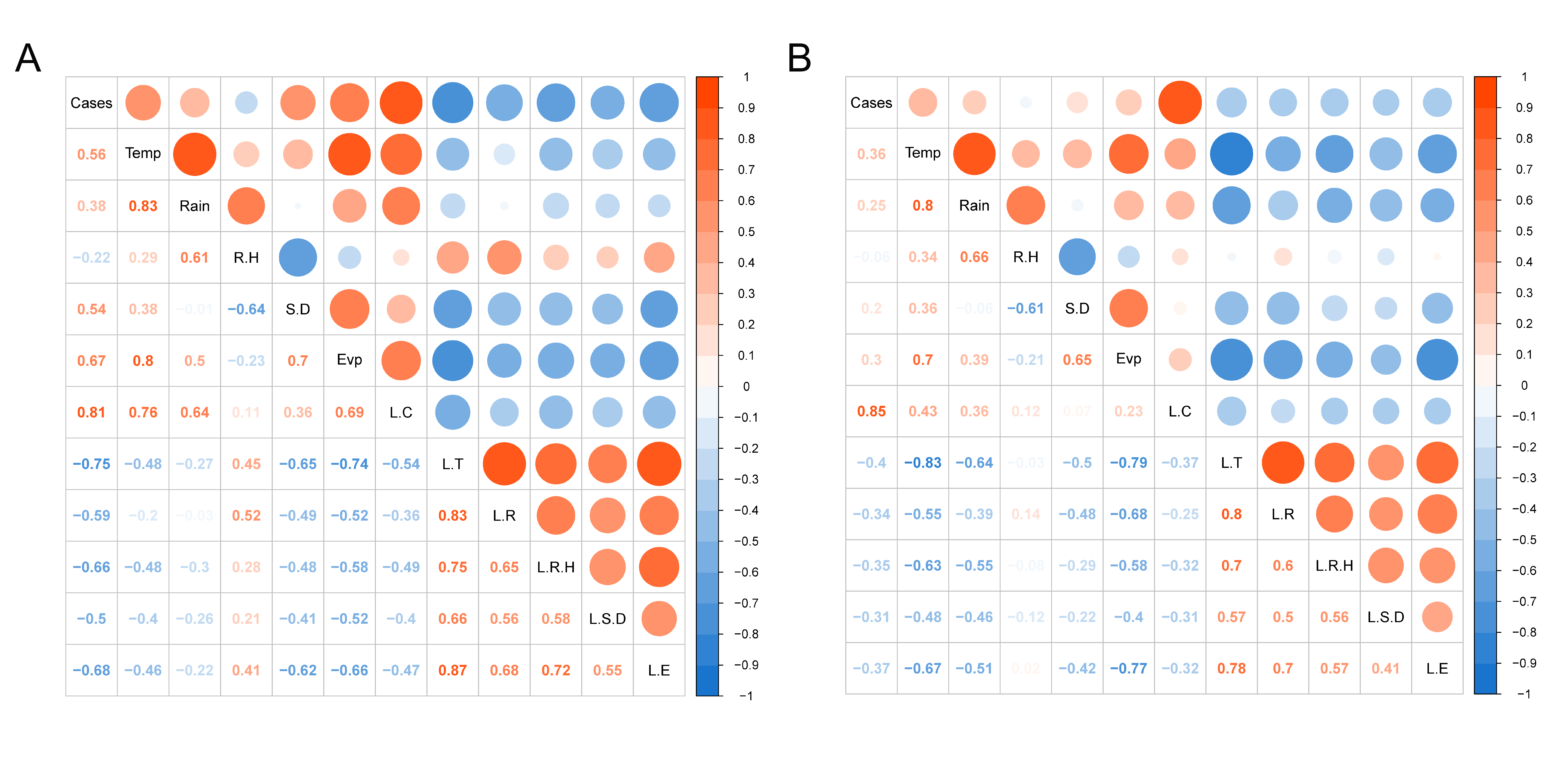 Cases: monthly number of human brucellosis; Temp: monthly mean temperature; Rain: monthly mean rainfall; R.H: monthly mean relative humidity; S.D: monthly cumulative sunshine duration; Evp: monthly cumulative evaporation; L.C: lag of monthly number of human brucellosis; L.T: lag of monthly mean temperature; L.R: lag of monthly mean rainfall; L.R.H: lag of monthly mean relative humidity; L.S.D: lag of monthly cumulative sunshine duration; L.E: lag of monthly cumulative evaporation.
