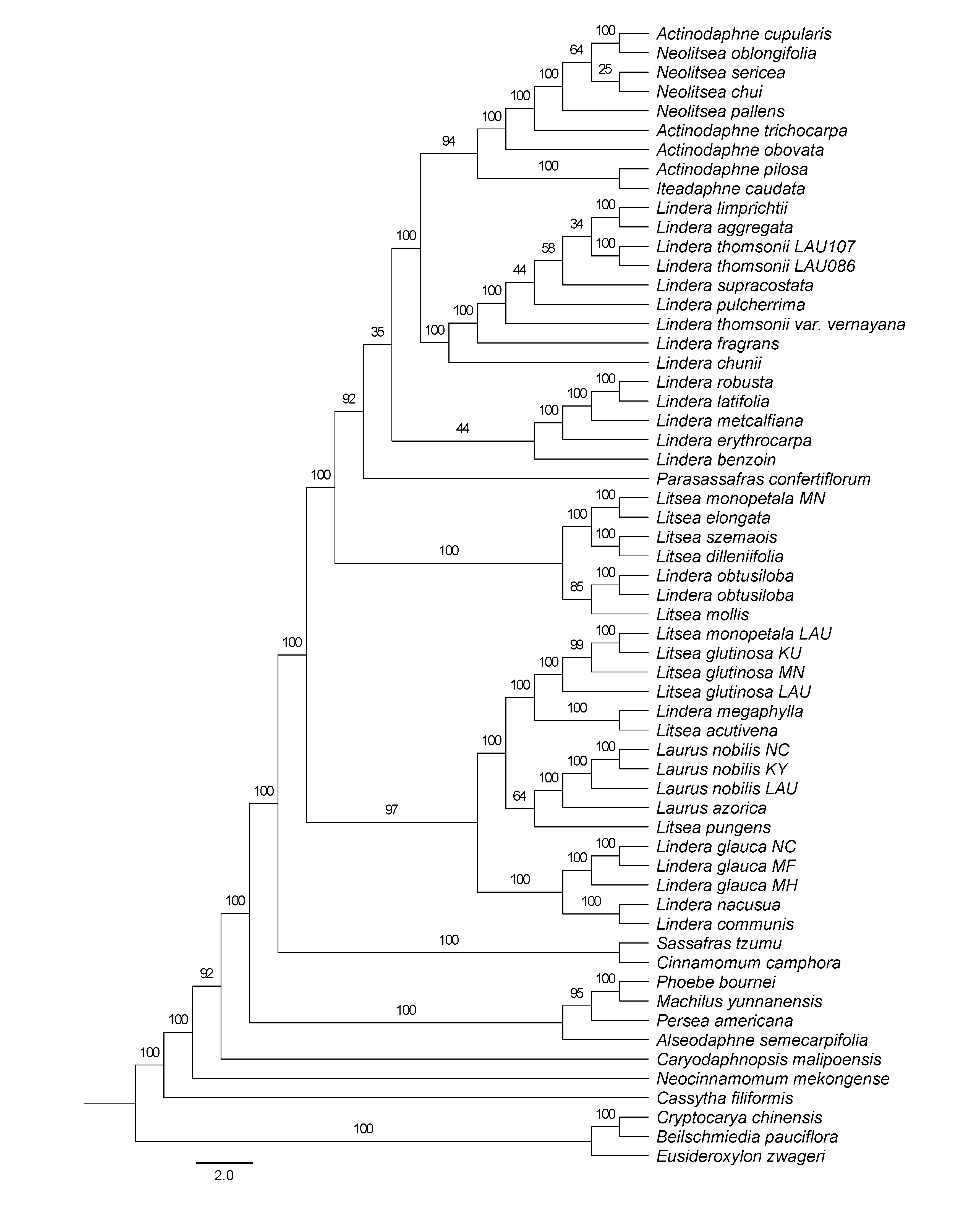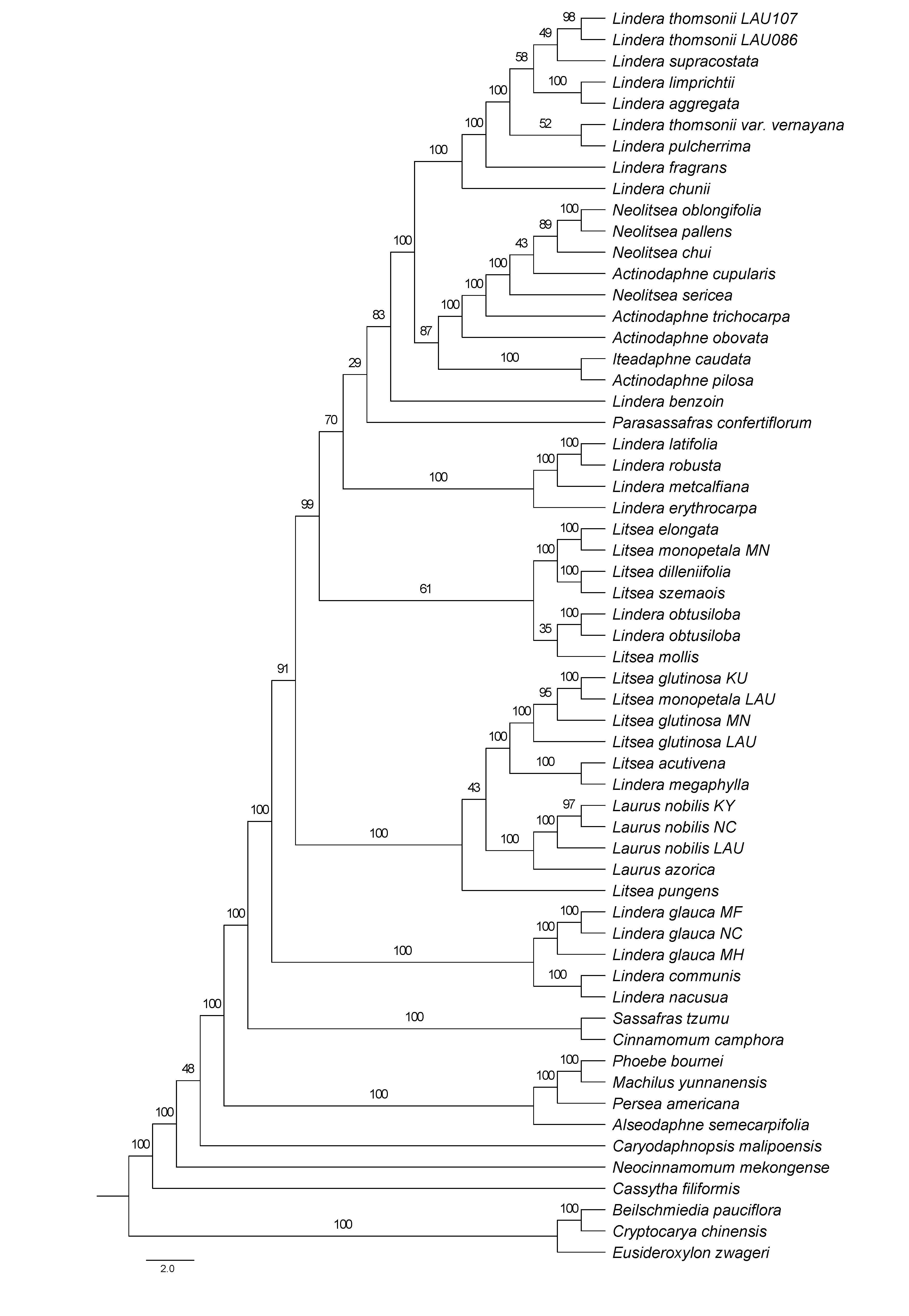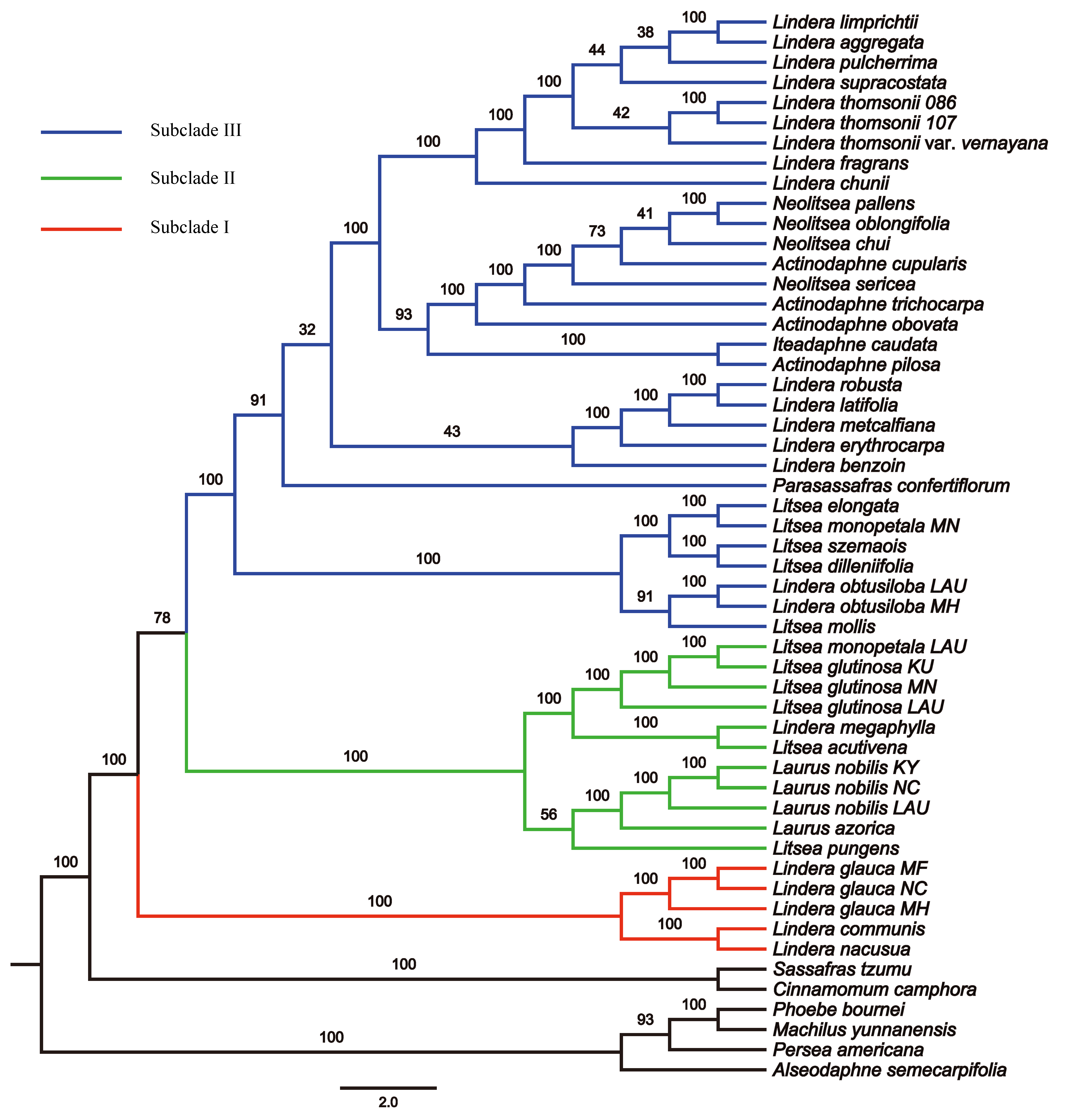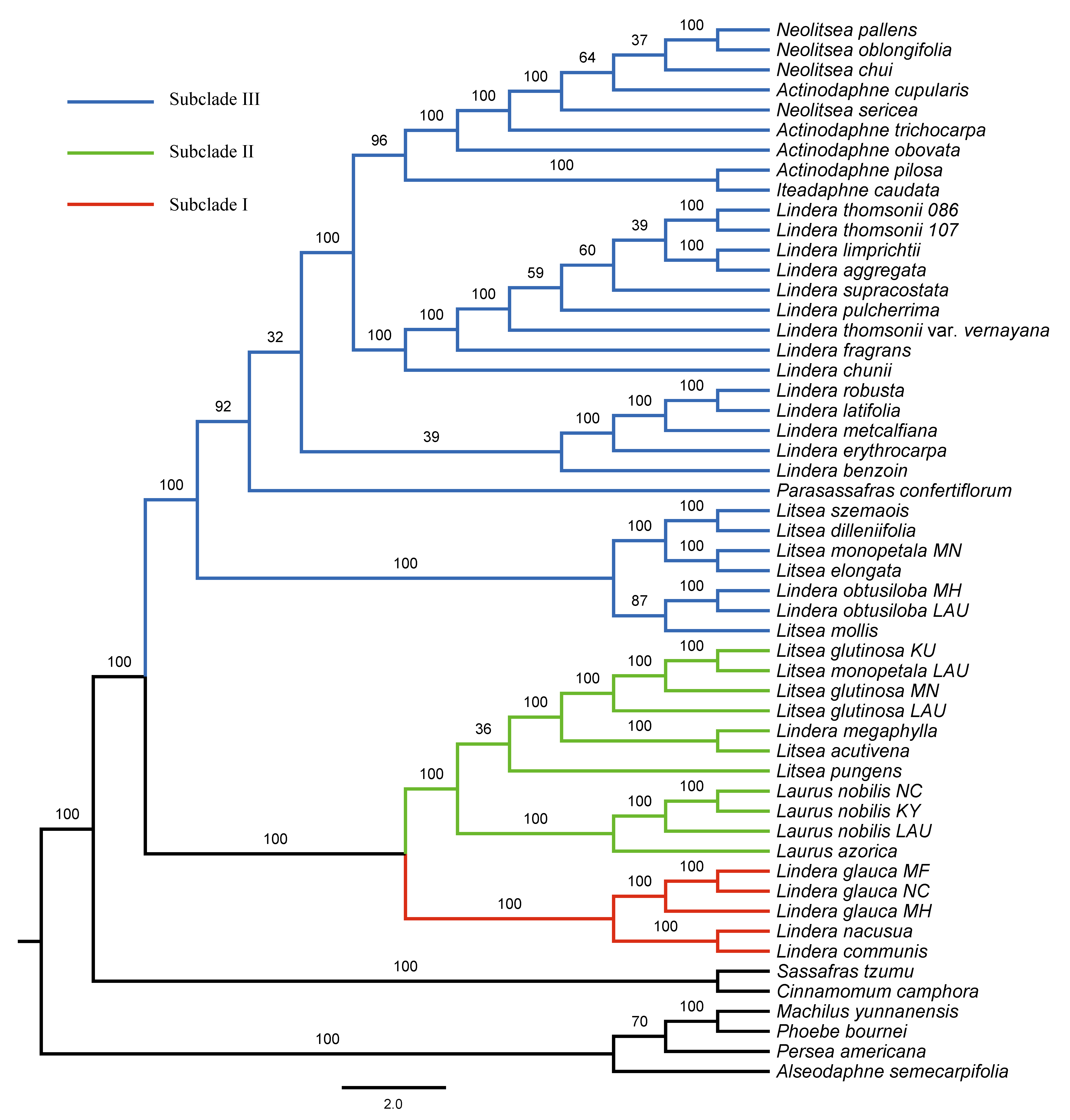 We found that the plastomes of Laureae have low inter-specific variation and are highly similar in structure, size, and gene content. Laureae was divided into three groups, subclades I, II and III. The inclusion of non-coding regions changed the phylogenetic relationship among the three subclades. Topologies based on coding and non-coding regions were largely congruent except for the relationship among subclades I, II and III. By measuring the distribution of phylogenetic signal across loci that supported different topologies, we found that nine loci (two coding regions, two introns and five intergenic spacers) played a critical role at the contentious node.