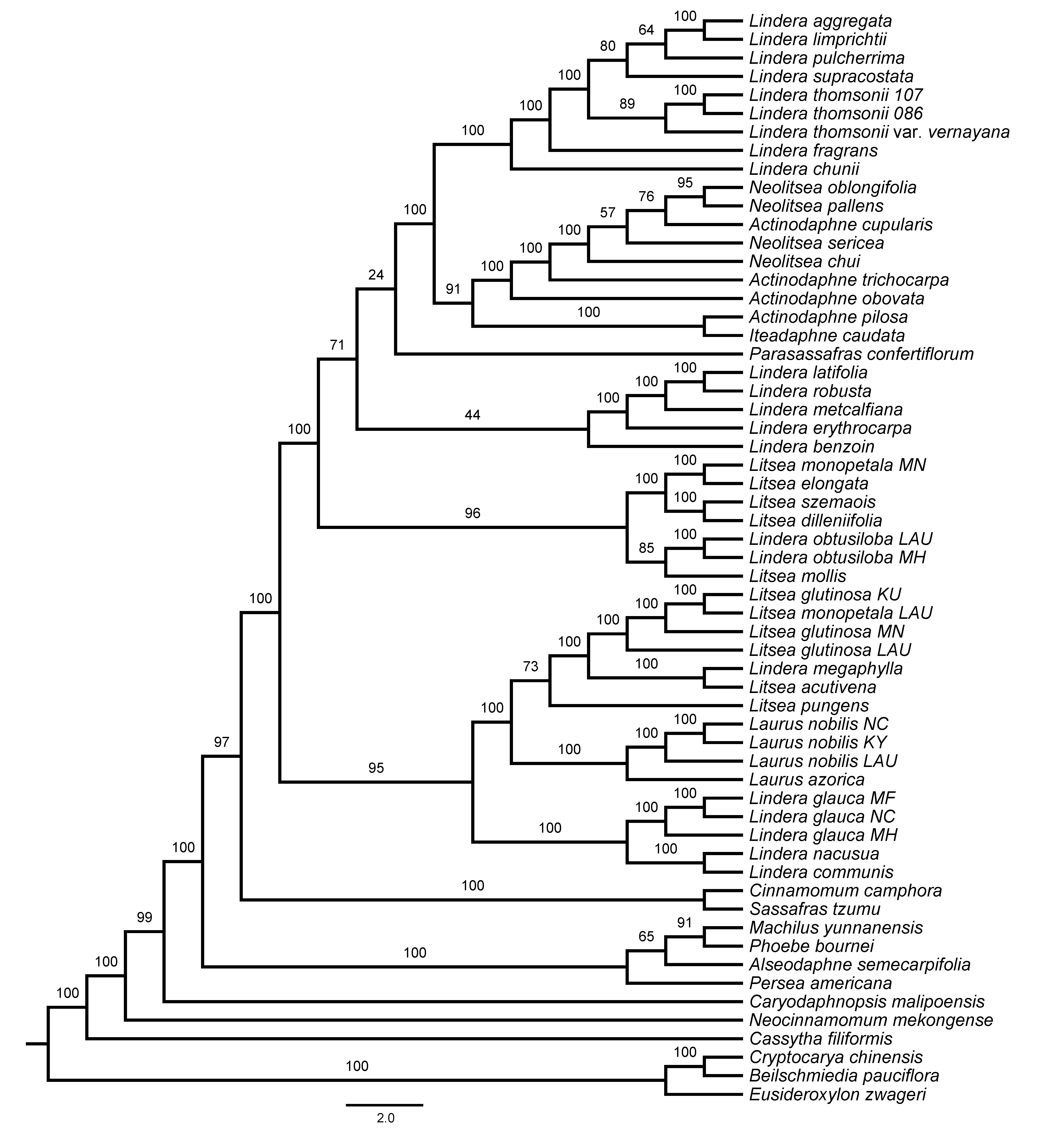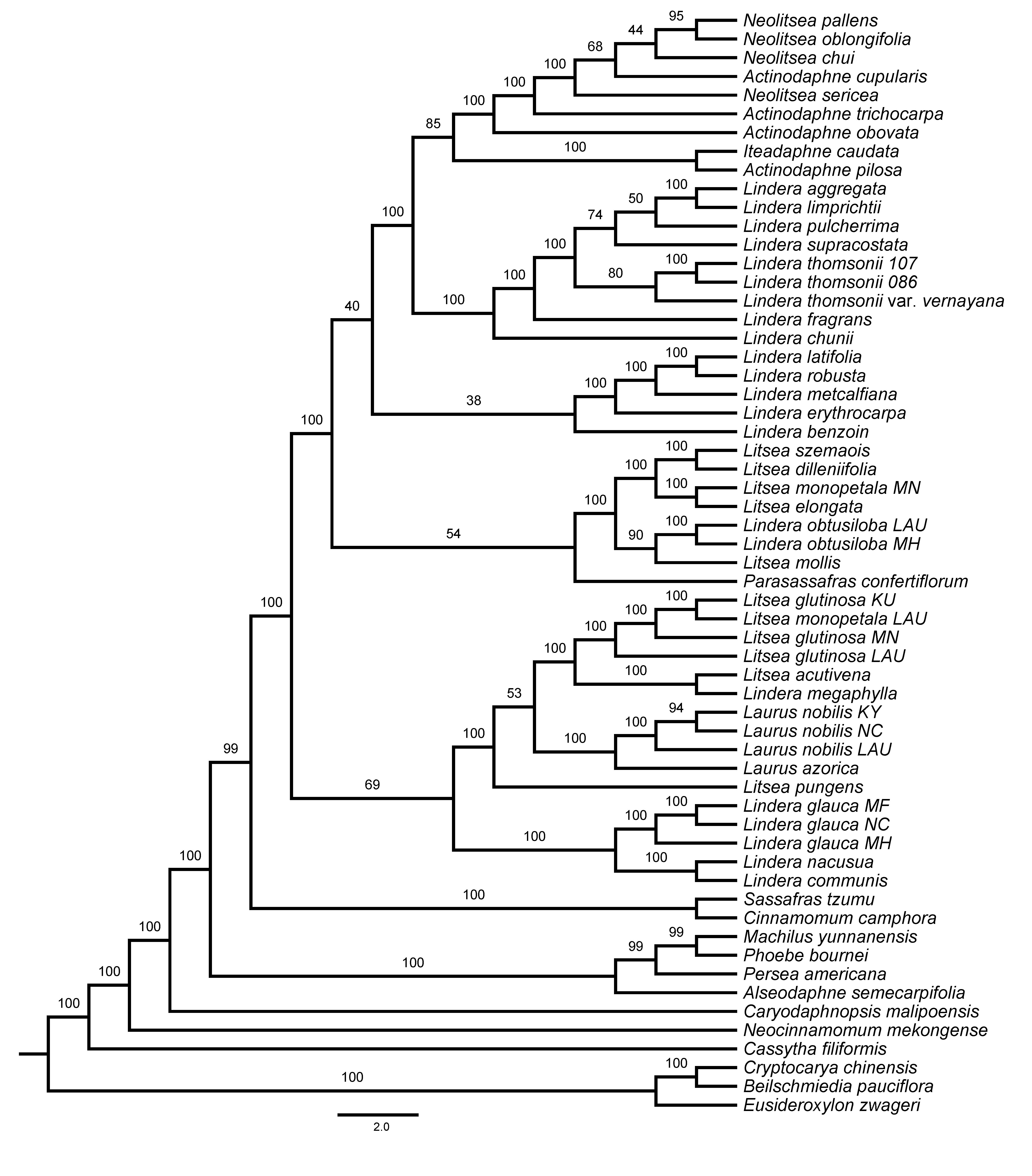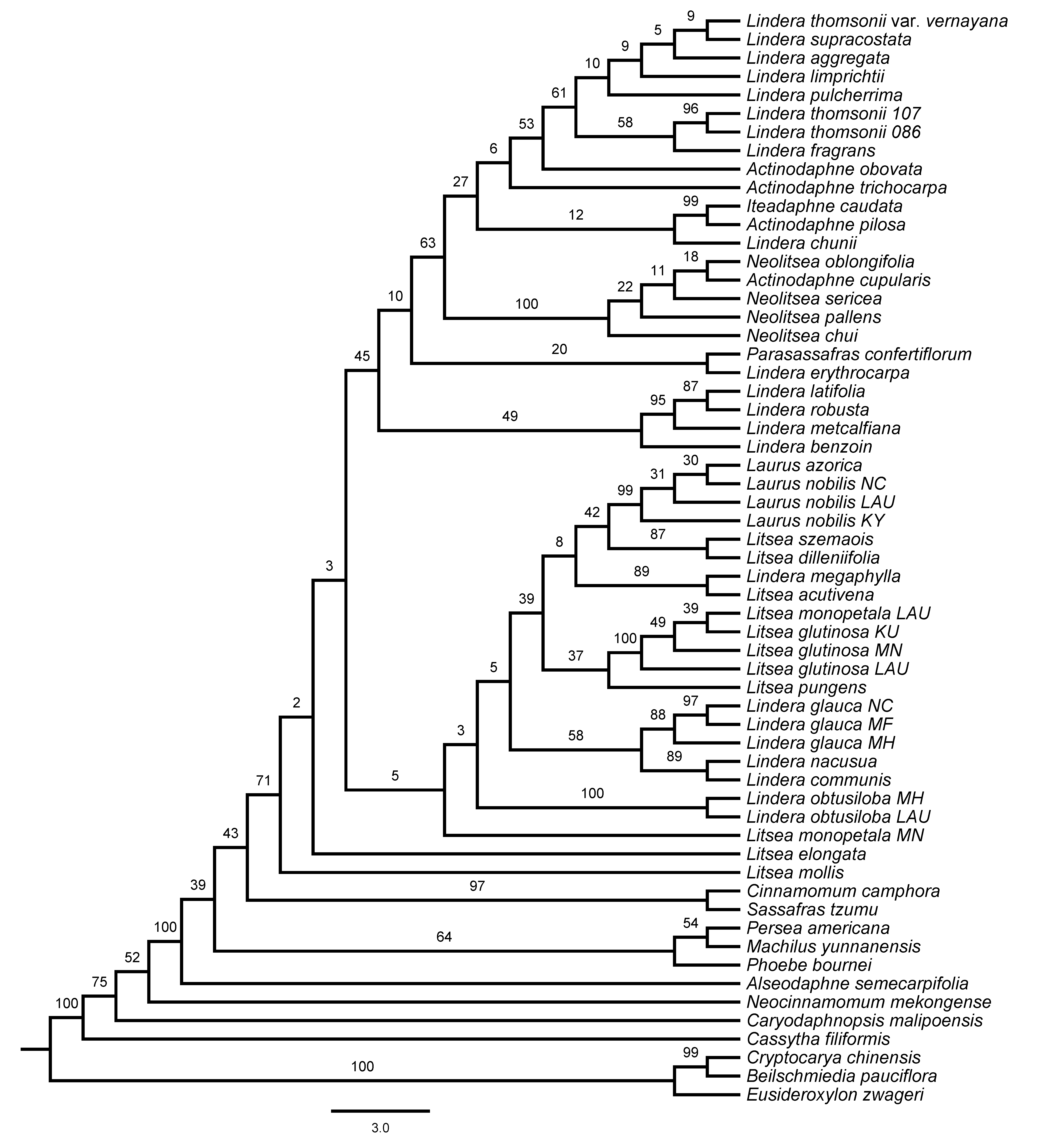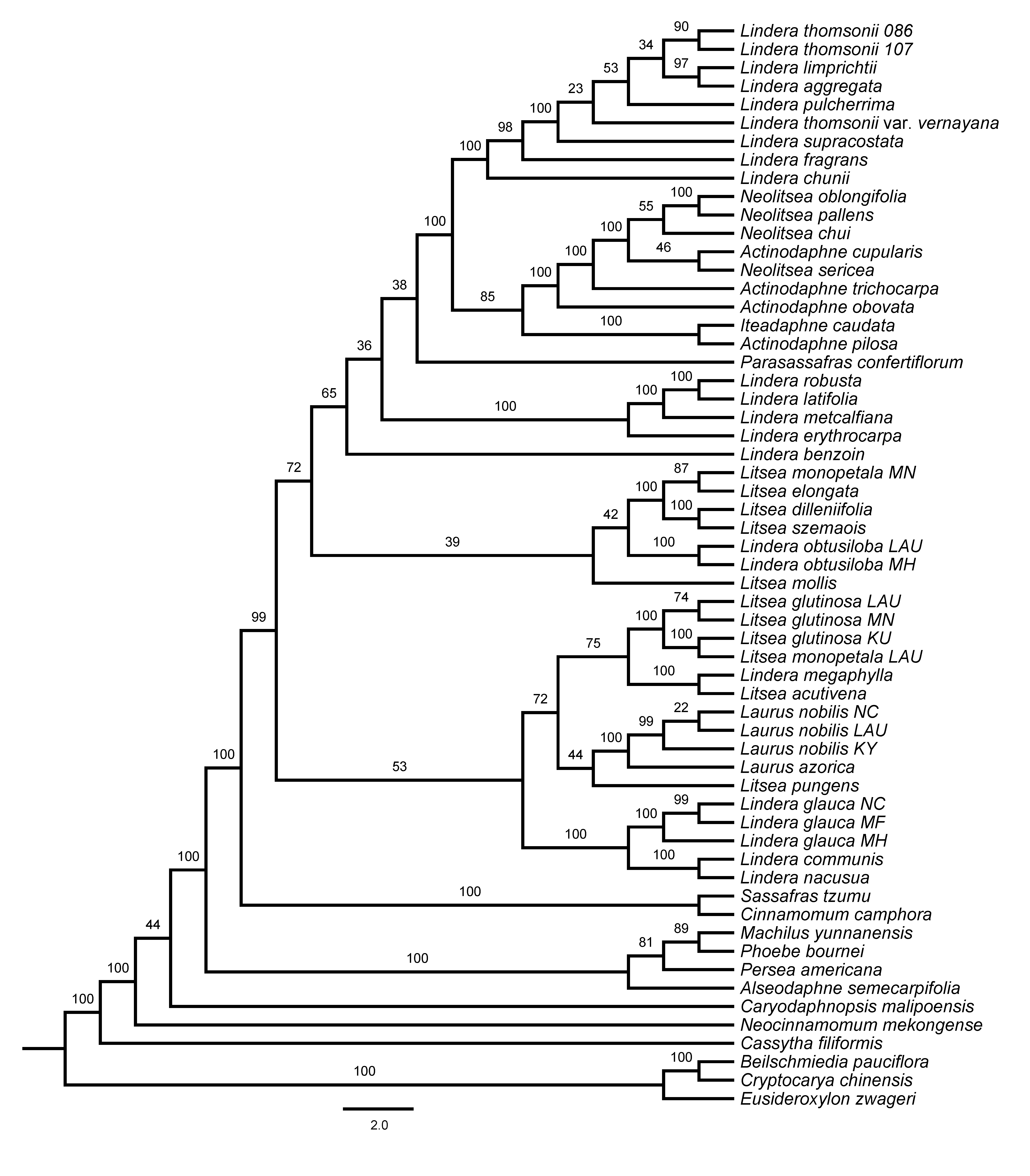 We found that the plastomes of Laureae have low inter-specific variation and are highly similar in structure, size, and gene content. Laureae was divided into three groups, subclades I, II and III. The inclusion of non-coding regions changed the phylogenetic relationship among the three subclades. Topologies based on coding and non-coding regions were largely congruent except for the relationship among subclades I, II and III. By measuring the distribution of phylogenetic signal across loci that supported different topologies, we found that nine loci (two coding regions, two introns and five intergenic spacers) played a critical role at the contentious node.