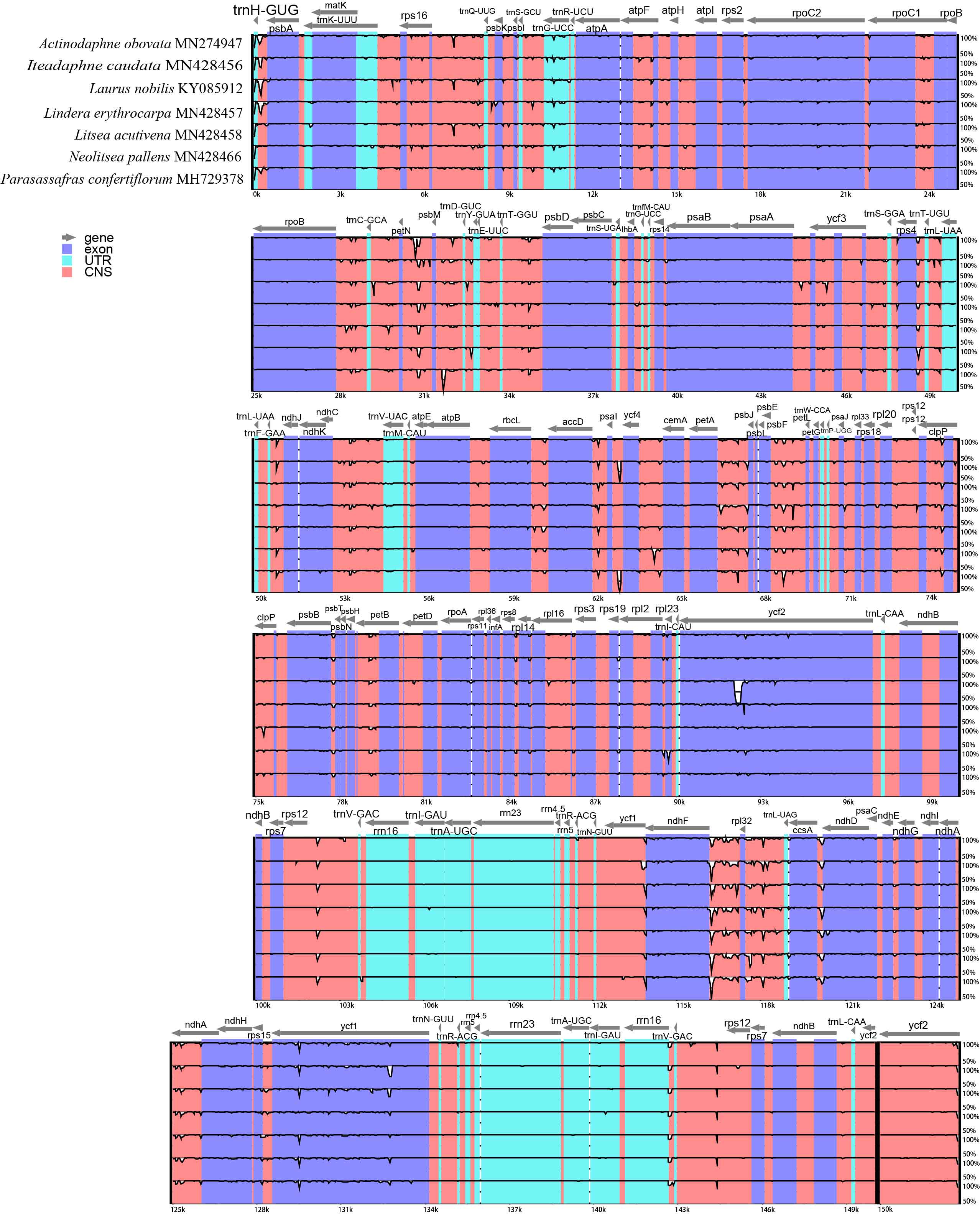 mVISTA percent identity plot of the seven plastomes of Laureae using Lindera glauca (Genbank accession number: MF188124) as a reference