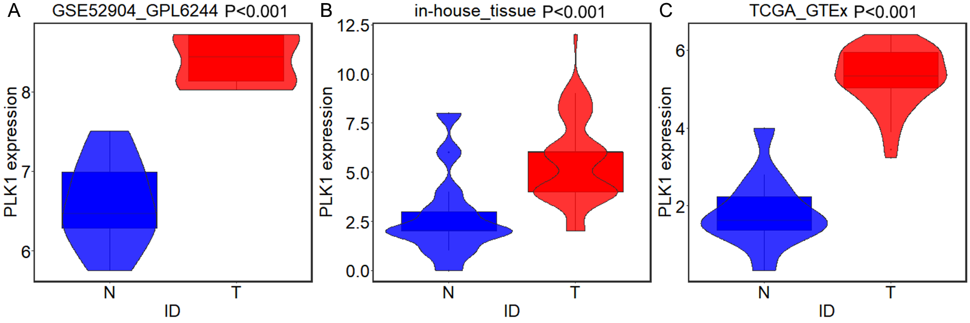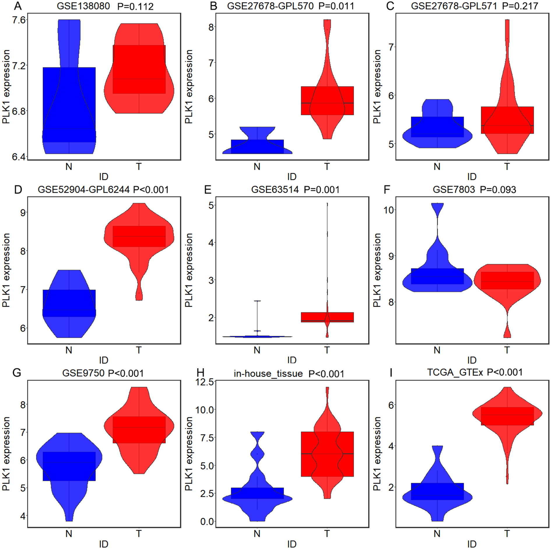 (A) Violin plots for GSE138080; (B) Violin plots for GSE27678 (GPL570); (C) Violin plots for GSE27678 (GPL571); (D) Violin plots for GSE39001 (GPL201); (E) Violin plots for GSE39001 (GPL6244); (F) Violin plots for GSE55940; (G) Violin plots for GSE63514; (H) Violin plots for GSE63678; (I) Violin plots for GSE6791; (J) Violin plots for GSE7410; (K) Violin plots for GSE7803; (L) Violin plots for GSE89657; (M) Violin plots for GSE9750; (N) Violin plots for GSE52904 (GPL6244); (O) Violin plots for TCGA-GTEx datasets; (P) Violin plots for in-house tissue microarrays. The expression shown in blue is for individuals without cancer, and the expression shown in red is for individuals with cancer.Clinico-pathological variables | High PLK1 expression | Low PLK1 expression | χ2 | P | ||