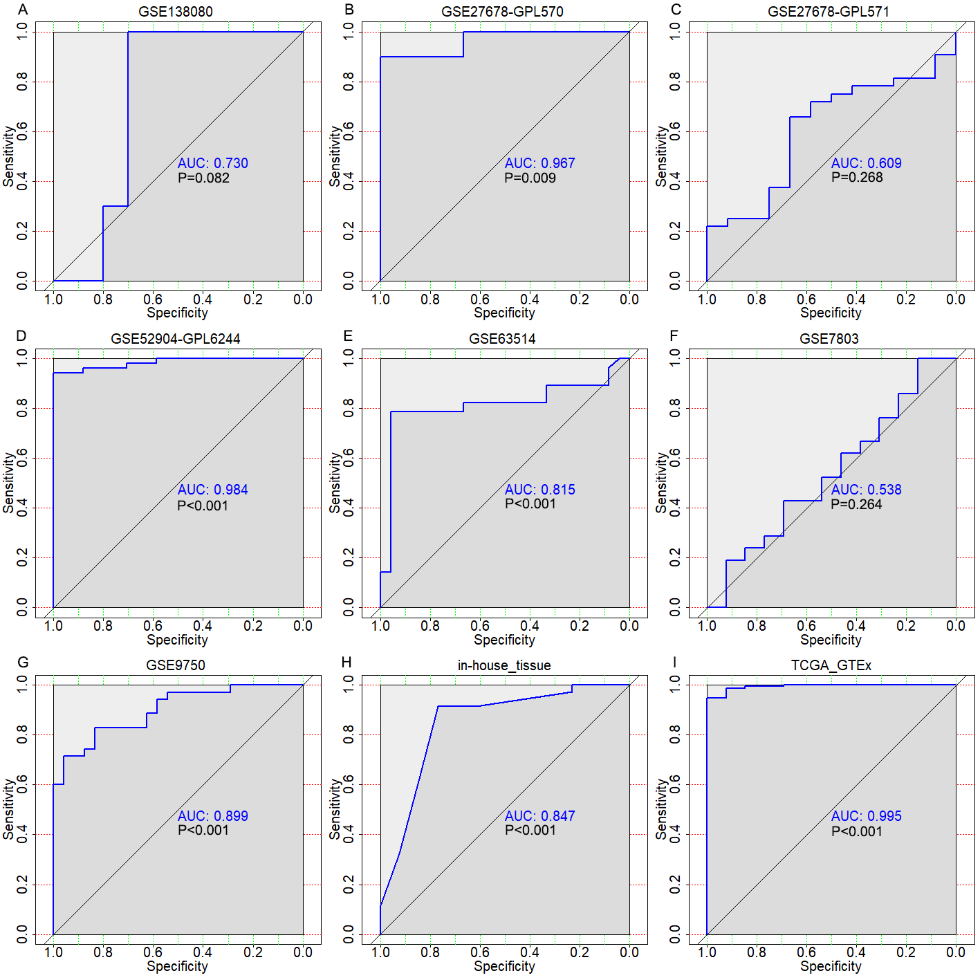 Figure 2: The discriminatory ability of PLK1 expression in distinguishing cervical cancer from non-cancer tissues in each microarray and RNA-seq dataset.