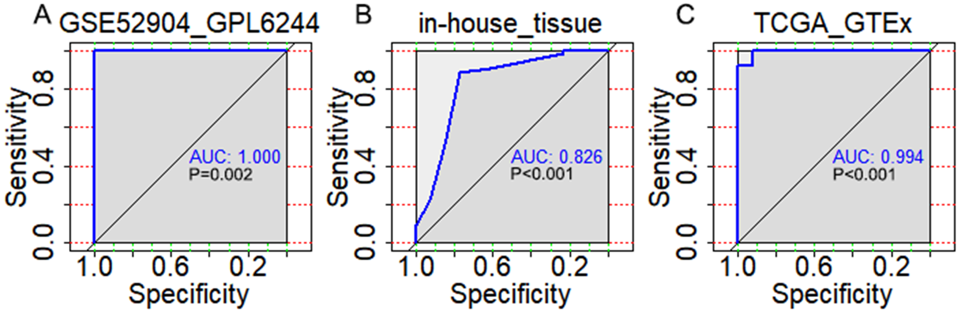 (A) SMD forest for CESC. (B) SROC curves for CESC. (C) SMD forest for cervical adenocarcinoma.Figure 6: Pooled SMD forest plot and SROC curves of PLK1 in all types of cervical cancer for in-house tissue microarray, external microarrays and RNA-seq datasets.