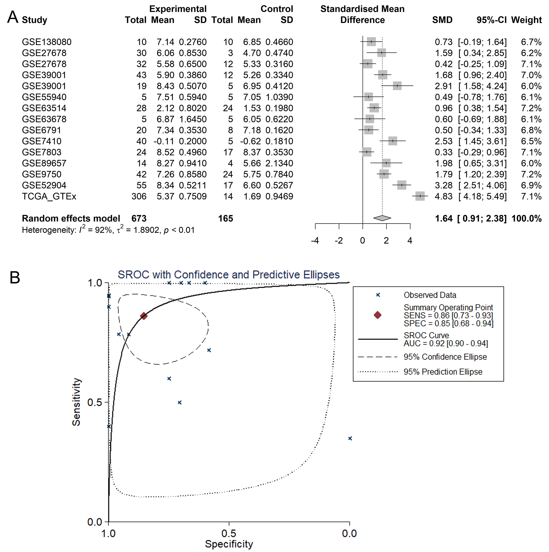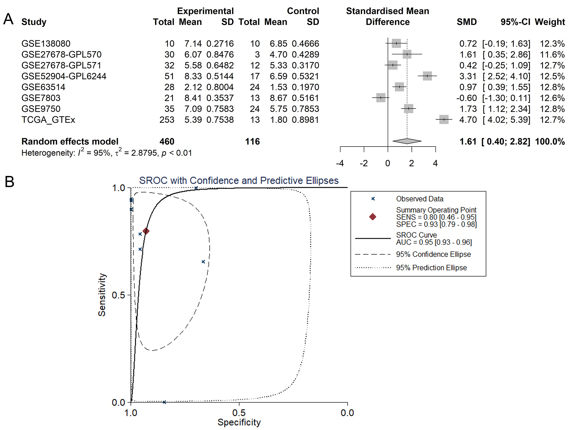 (A) SMD forest. (B) SROC curves.Prognostic value of PLK1 expression in cervical cancer