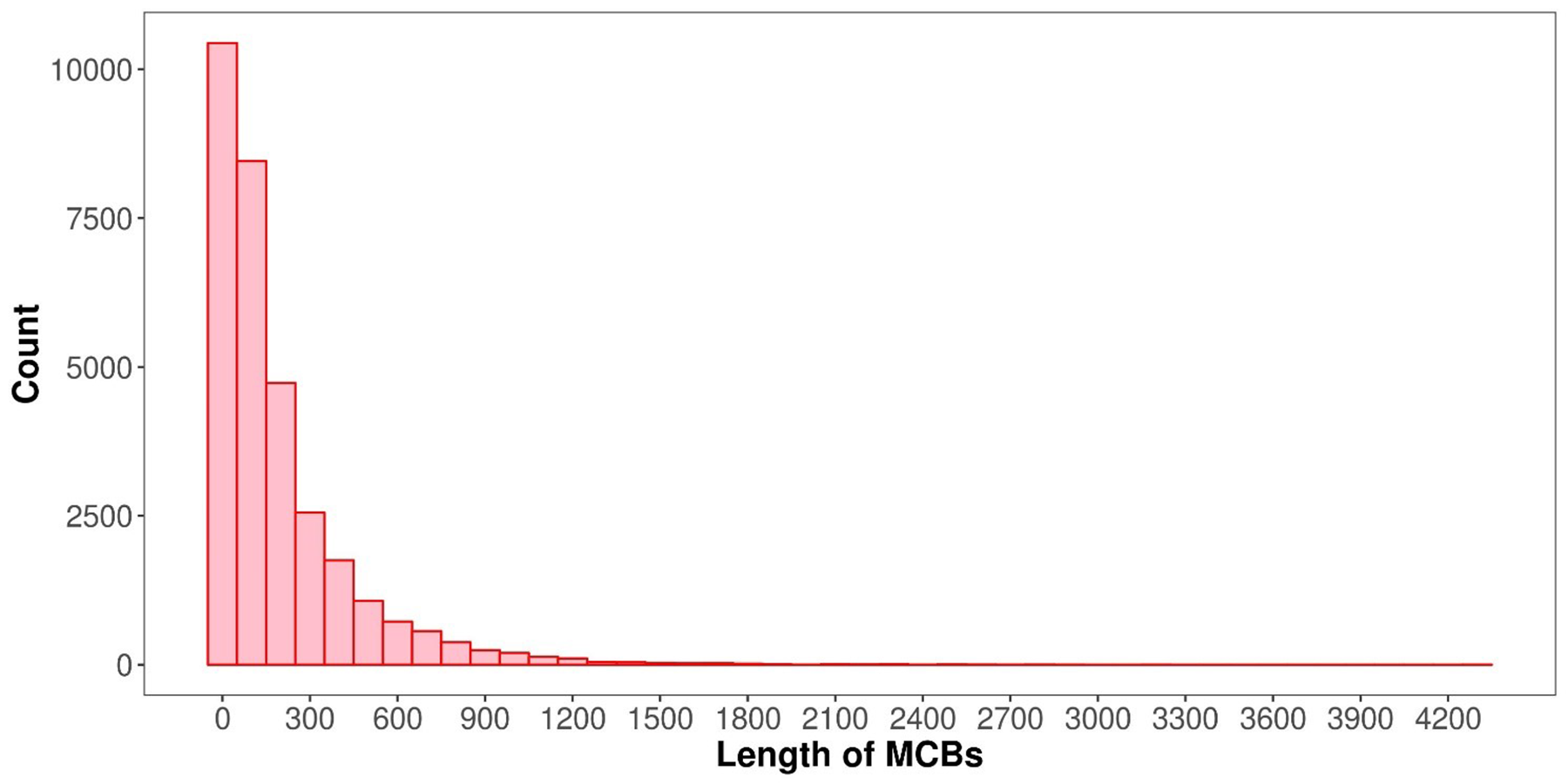 The MCB quantities for the chromosomes are shown in Fig. 2B. The MCB quantities did not correlate with chromosome length, although chromosome 1 had the greatest quantity of MCBs. MCB lengths ranged from 3 bp to 4,283 bp and had an average of 193 bp (Fig. S1). The minimum number of CpG sites within the individual MCB was 2, while the maximum number was 45 (Fig. S2).