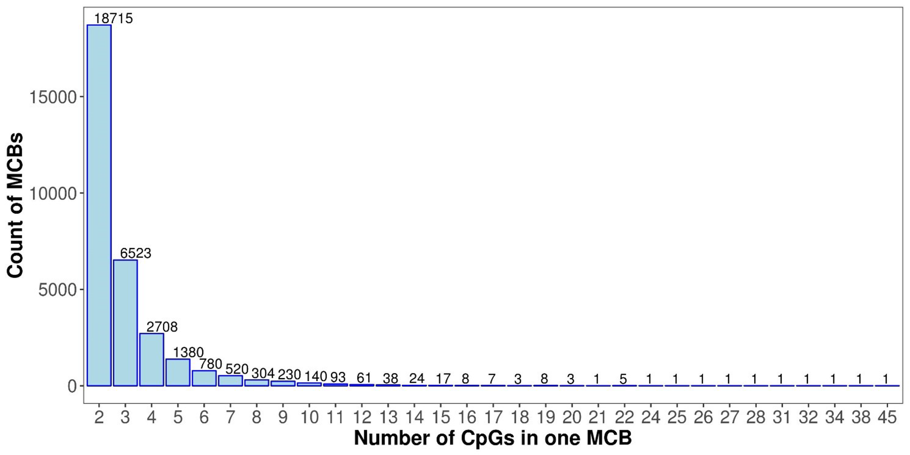 This procedure identified a total of 31,726 MCBs, with two to 45 CpG positions in each block. We also calculated the Pearson correlation coefficients between the two adjacent CpGs and the standard deviations.