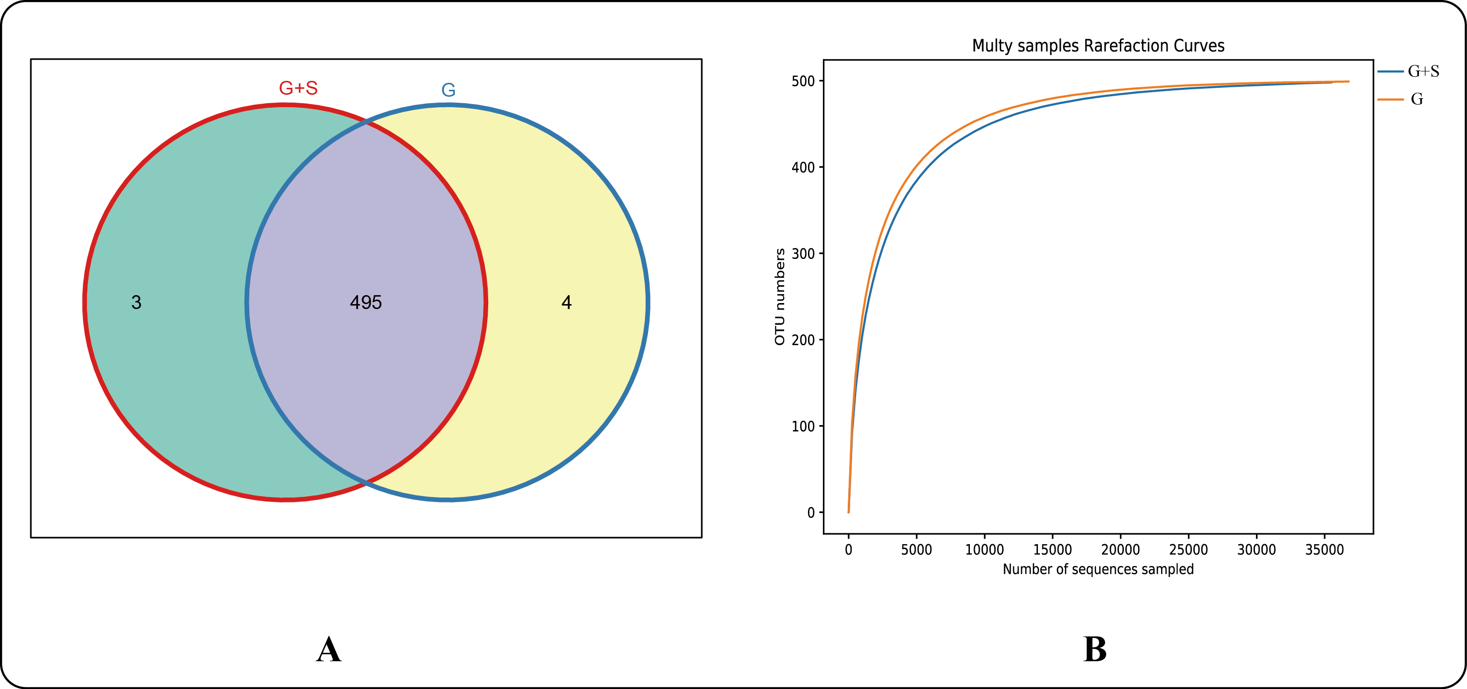 A total of 160,213 pairs of reads were obtained by 16S rRNA gene sequencing (paired-end), and 127,677 clean tags were generated after merging of paired-end reads and filtering. Each sample generated at least 63,772 clean tags and a mean of 63,839 clean tags (with a mean sequence length of 412 bp). Tags were clustered at a similarity level of 97% using USEARCH software and 502 OTUs were obtained. There were 498 OTUs in the G+S group and 499 in the G group, with 3 and 4 unique OTUs in the G+S and G groups, respectively (Fig. S1A). Rarefaction curves (Fig. S1B) indicate the species diversity and species richness in both groups. Limited new OTUs were observed after approximately 20,000 reads, indicating that the sequencing coverage was sufficient. There were no significant differences in the α-diversity indices between the two groups (P > 0.05) (Table 2).