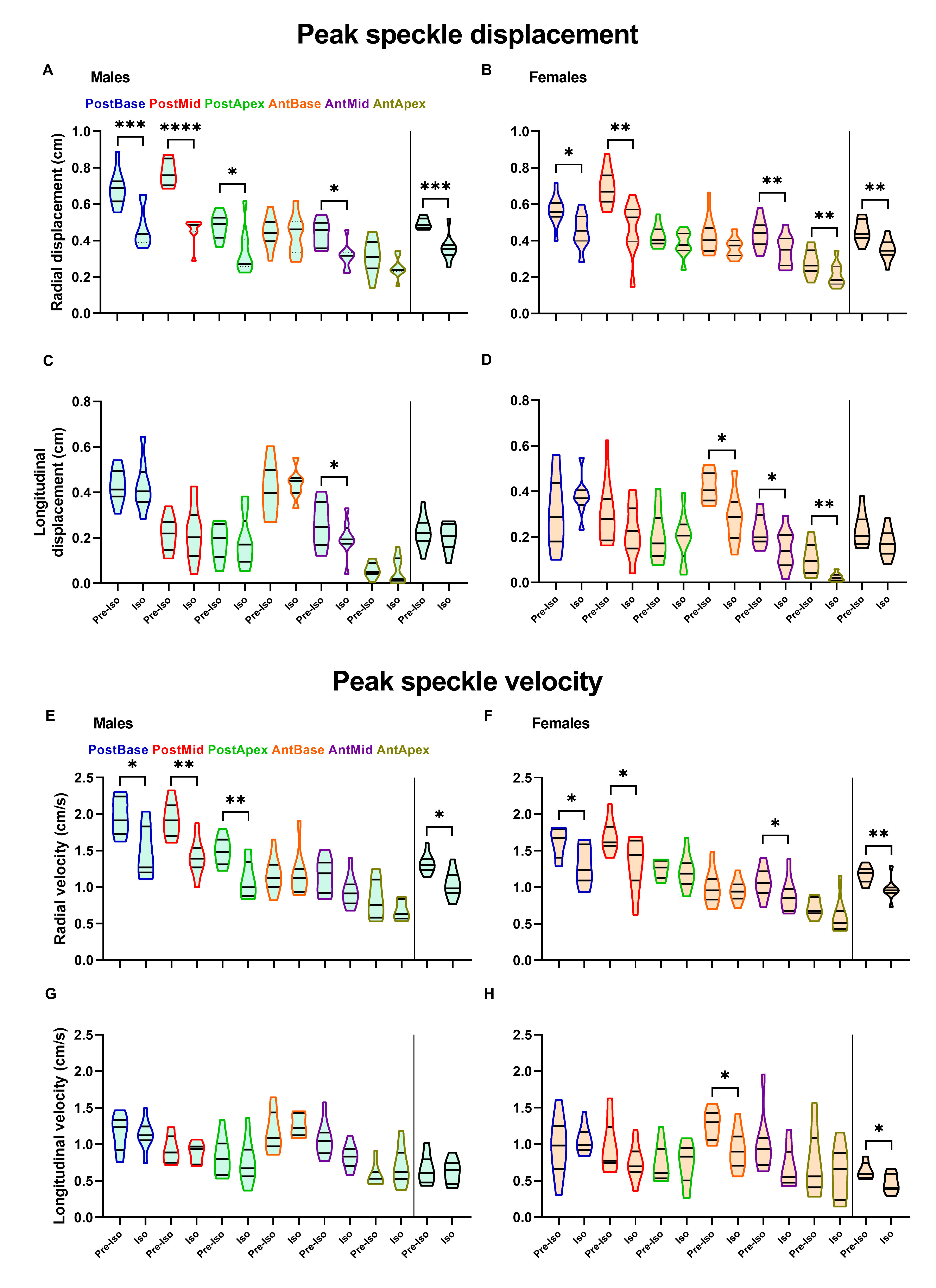 Radial and longitudinal strains can be obtained using the parasternal long axis (PSLAX) view. The six segments are also identified. Characters colors correspond to those used in the graphs for each of these LV segments. Ant, anterior, Post, posterior. Before after effects of Iso on the strain. Radial (A–B) and longitudinal (C–D) peak strains were obtained using the parasternal long axis view. The six segments are identified. Characters colors correspond to those used in the graphs for each of these LV segments.Radial (E–F and G–H) and longitudinal (I–J and K–L) peak strains were grouped either as from the base, the midsection or the apex or as from the anterior or the posterior segments in males (left panels) and females (right panels). Ant, anterior, Post, posterior. Males are represented on the left panels and females on the right. Results are represented as violin plots ( n = 8–10). Inner black lines represent quartiles of the data. Significance between groups was calculated with paired Student’s T-test. *, p < 0.05, **, p < 0.01, ***, p < 0.001 and ****, p < 0.0001 between corresponding pre-Iso and Iso animals.Statistical analysis