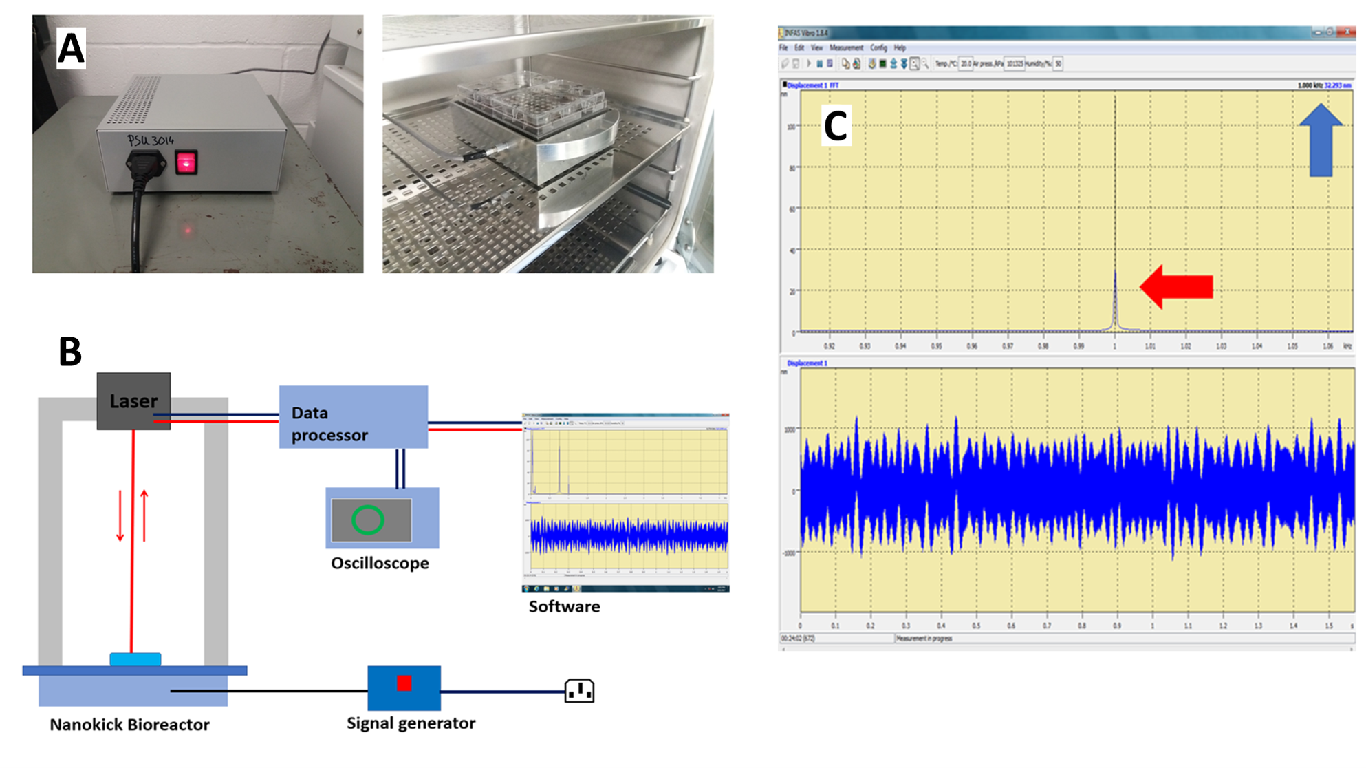 (A) Signal generator (left) and the Nanokick bioreactor in the incubator (right). Magnet-clamped plates can be seen on top of the bioreactor’s platform. (B) Laser interferometry was used to measure the frequency and the amplitude of the vibrations on the surface of the wells, which is the site where the mechanical stimulation was applied on the cells. Frequency and the amplitude of the vibrations were measured continuously over periods of 2–3 months, before and after experiments, to allow continuous assessment of the bioreactor’s functionality. The measurements were performed on the bioreactor twice; once after being left at room temperature (25 ° C) and another time after being incubated at 37 ° C for 24 h. During the laser interferometry, a continuous helium-neon beam (wavelength 632.8 nm) is reflected from the surface of the well at a distance of 25–30 cm and directed into the interferometer (SIOS Meßtechnik GmbH SP S-120) to create an interference pattern with a reference beam. Alignment of the beam is achieved by utilising an oscillator signal that appears as a circle on the oscilloscope’s screen. (C) The interferometers output is then analysed by INFAS Vibro computer software (SIOS Meßtechnik GmbH: Interferometry Analysis Software for Vibrometers), which performs a fast fourier transform (FFT) and plot the amplitude of motion in frequency space. The red arrow shows the frequency reading (1 kHz), and the blue arrow shows the amplitude of vibration (32.3 nm).