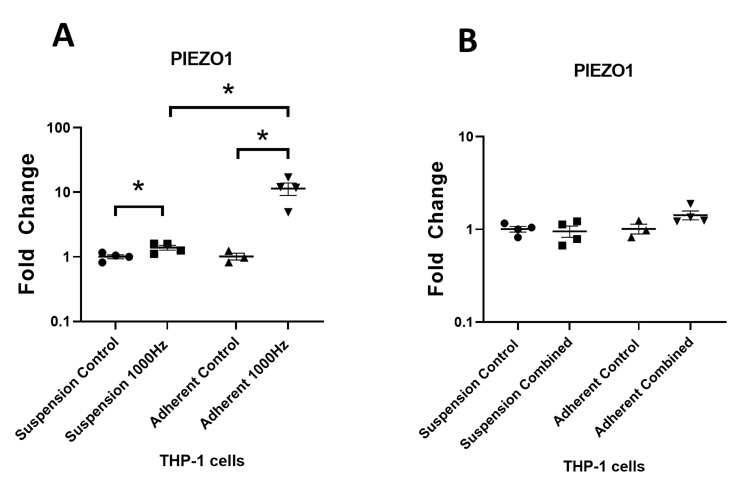 A comparison of PIEZO1 expression between adherent and suspension cells stimulated with 1,000 Hz vibrations and the combined treatment was performed (Fig. S3). The 1,000 Hz vibrations upregulated PIEZO1 stronger in adherent cells, than in the suspension cells (Fig. S3A). No difference was observed between the adherent and suspension cells stimulated with the combined treatment (Fig. S3B).