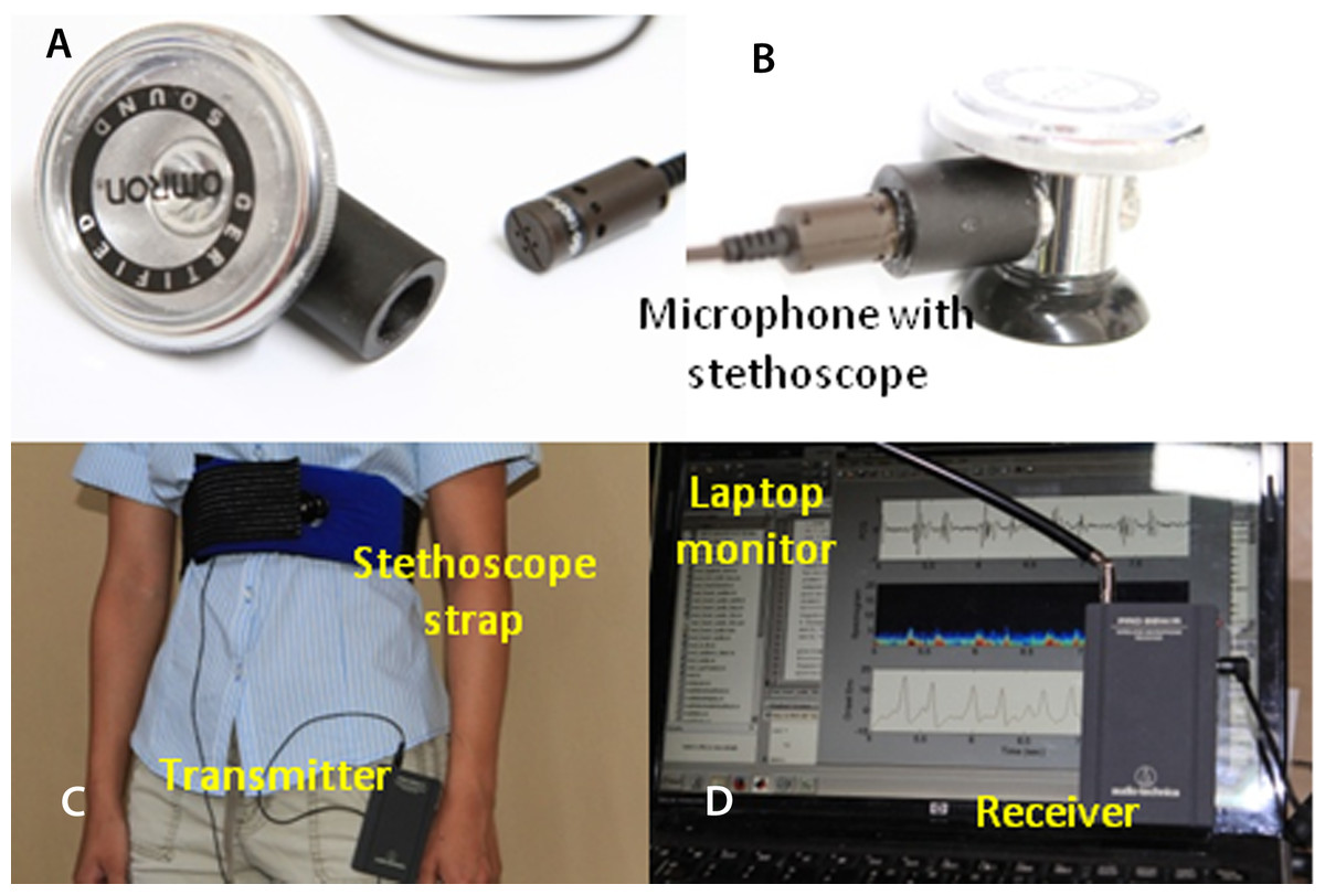 Off-the-shelf microphone and stethoscope (A). Side view of the assembled stethoscope head (B). (C) the stethoscope strap; (D) laptop’s screen and microphone receiver unit.A chest strap was made from a body icing kit purchased from CVS pharmacy (Caldera Multi-Purpose Therapy Wrap; SCO, Lindon, Utah, USA; $12.99). The kit was modified after the gel was removed. Polyester foam ($5), sold for pillow stuffing, is inserted into the pad sleeve to shield the microphone from acoustic noise and to provide a cushioned contact with the chest. A hole in the pad allows positioning the microphone in the middle of the pad and keeping it in contact with the chest (see Fig. 1C).