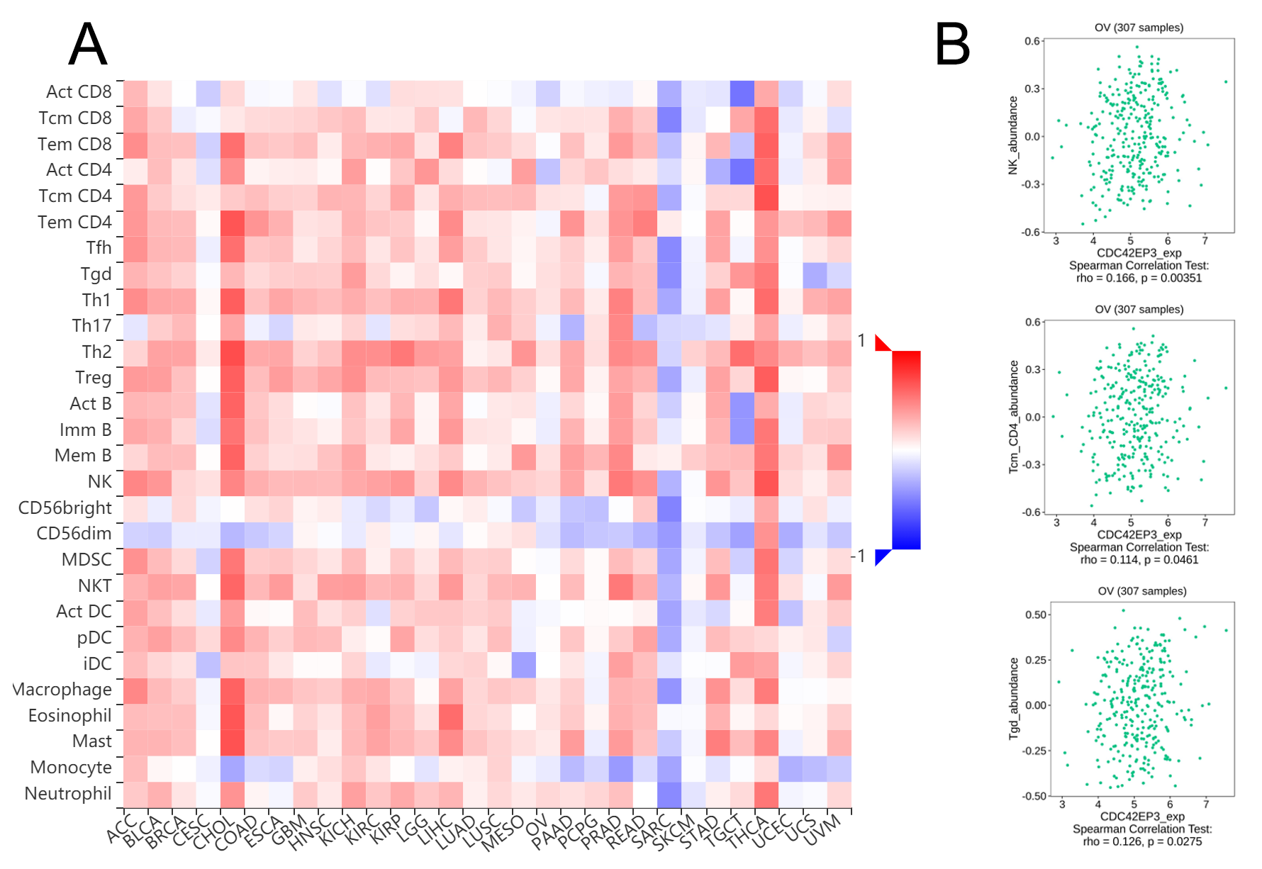 (A) Heatmap indicated the correlation between CDC42EP3 expression and immune cells analyzed by TISIDB. (B) The cross-validated correlation between CDC42EP3 expression and several immune cells, such as NK, Tcm and Tgd cells.