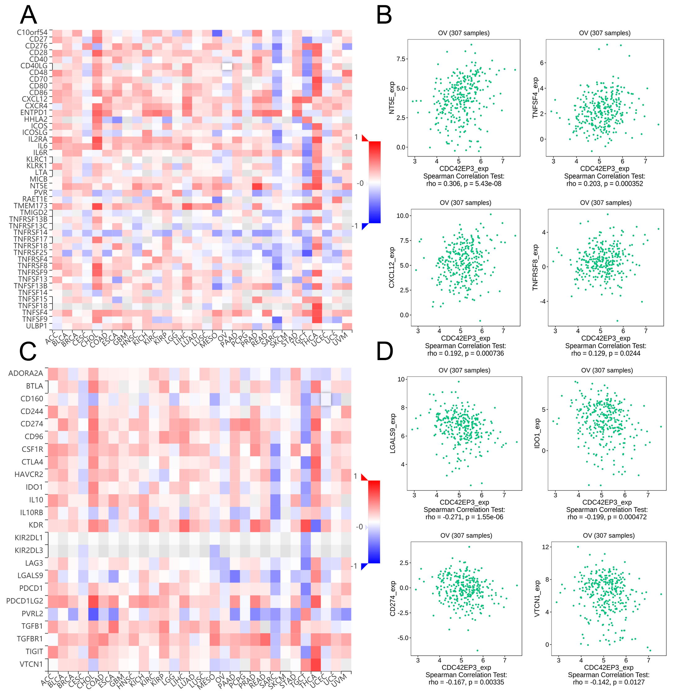 (A) The correlation between CDC42EP3 expression and multiple of immunostimulators. (B) The top four immunostimulators highly correlated with CDC42EP3 expression. (C) The correlation between CDC42EP3 expression and multiple of immunoinhibitors. (D) The top four immunoinhibitors highly correlated with CDC42EP3 expression.