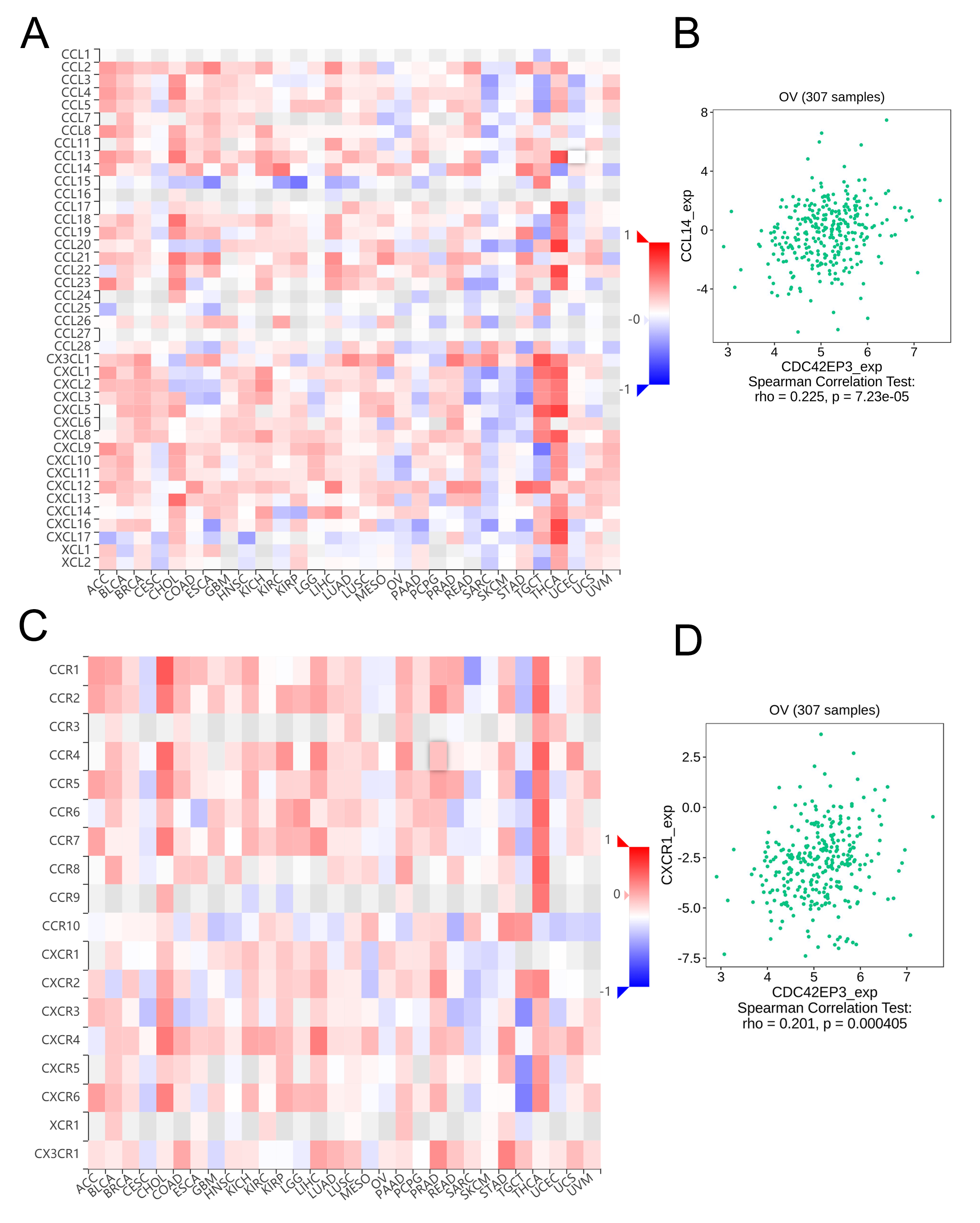 (A) The correlation between CDC42EP3 expression and chemokines. (B) The significant associations between CDC42EP3 expression and CCL14. (C) The correlation between CDC42EP3 expression and chemokine receptors. (D) The significant associations between CDC42EP3 expression and CXCR1.