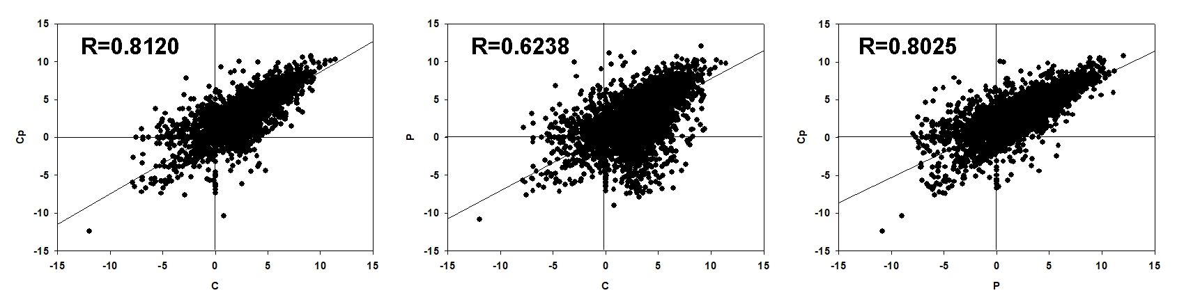 Correlation of FPKMs of all DEGs in pair-wise comparison among C, Cp, and P