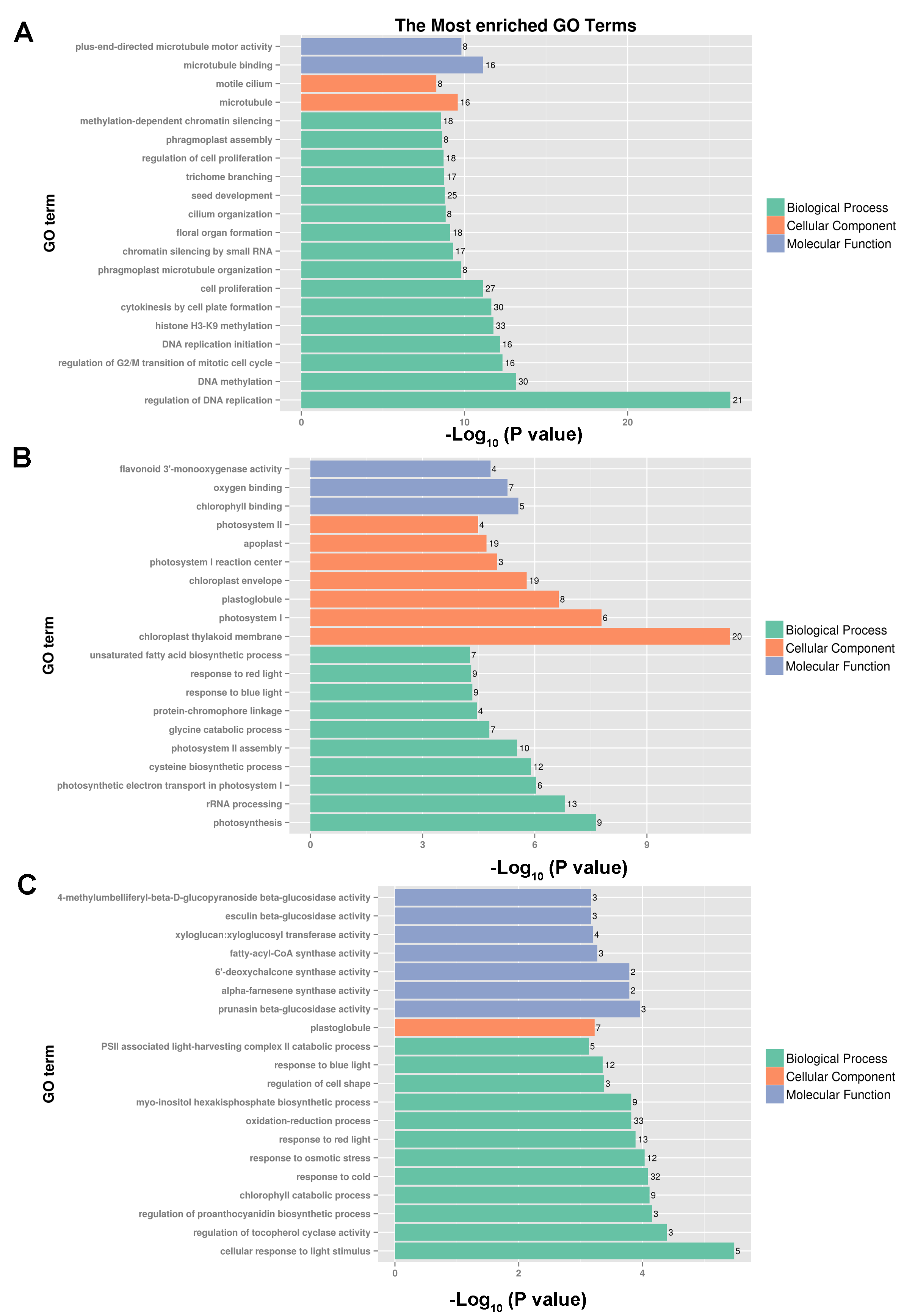 (A) The most enriched GO terms of cluster 1 with 719 annotated DEGs. (B) The most enriched GO terms of cluster 2 with 211 annotated DEGs. (C) The most enriched GO terms of cluster 3 with 638 annotated DEGs.