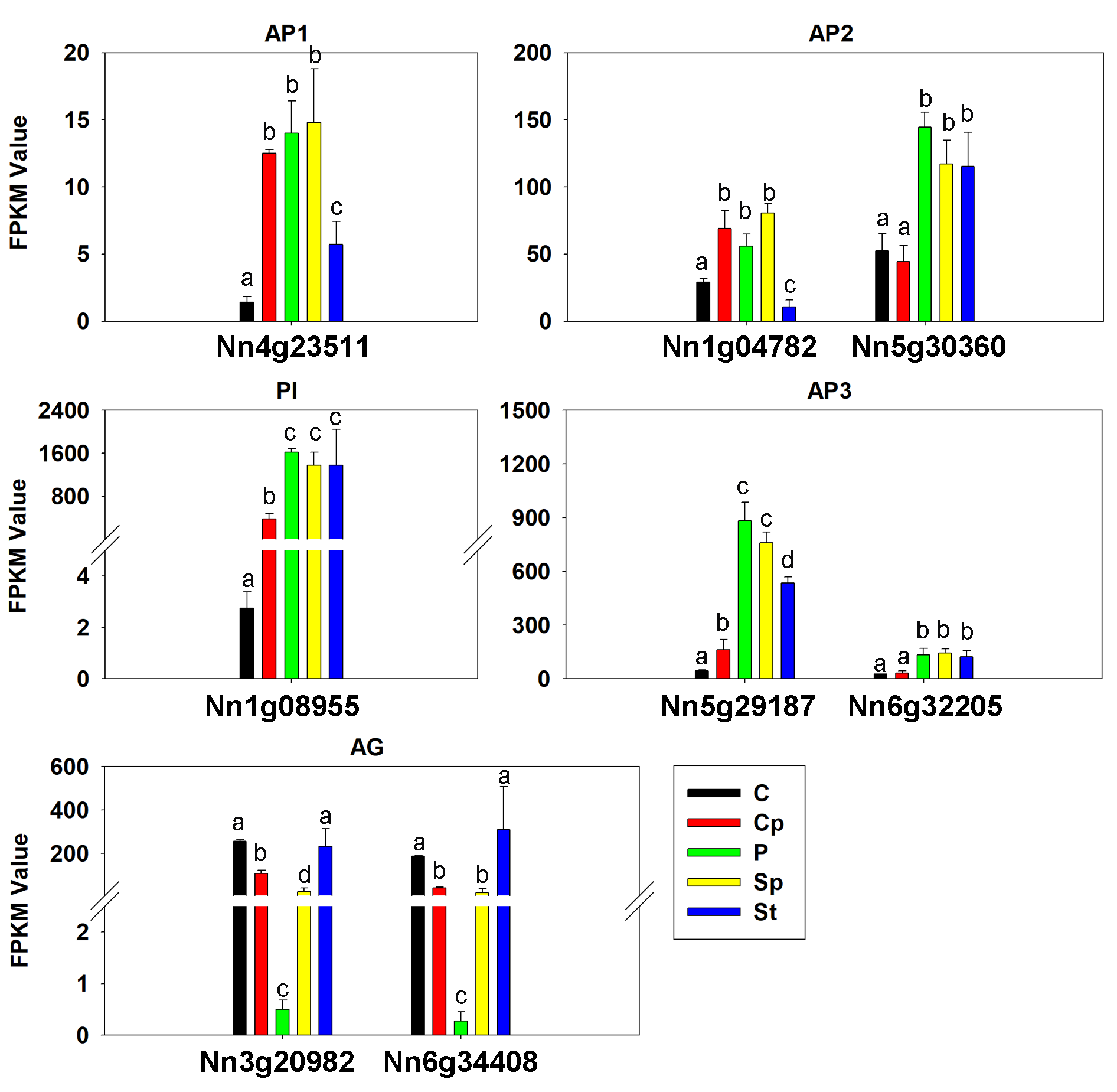 Values represent the means and standard errors (SEs) of three biological replicates. Petal: P; Carpel petaloidy: Cp; Carpel: C; Stamen petaloidy: Sp; Stamen: St. The FPKM values in Sp and St by RNA-seq were also analyzed (clean data of Sp and St by RNA-seq were deposited in NCBI with PRJNA524054). Data were analyzed with one-way ANOVA and Tukey’s multiple comparison test, p < 0.05.