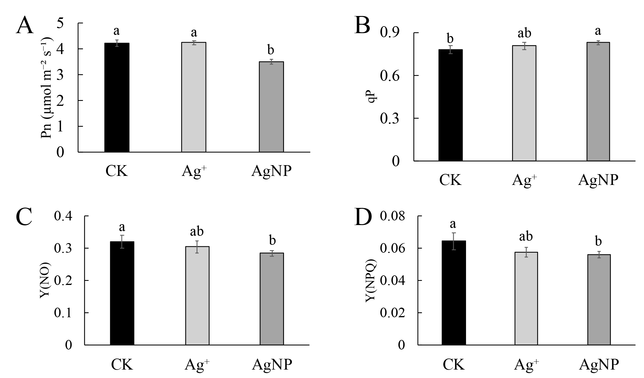 (A) Net photosynthetic rate (Pn), (B) coefficient of photochemical quenching (qP), (C) yield of nonregulated heat dissipation of PSII (Y(NO)) and (D) effective quantum yield of regulated nonphotochemical quenching (Y(NPQ)) of cotton leaves after Ag+ and AgNP treatments. Error bars represent the standard error of three biological replicates, and the same letters represent for no significant differences.Primary metabolite response to AgNPs