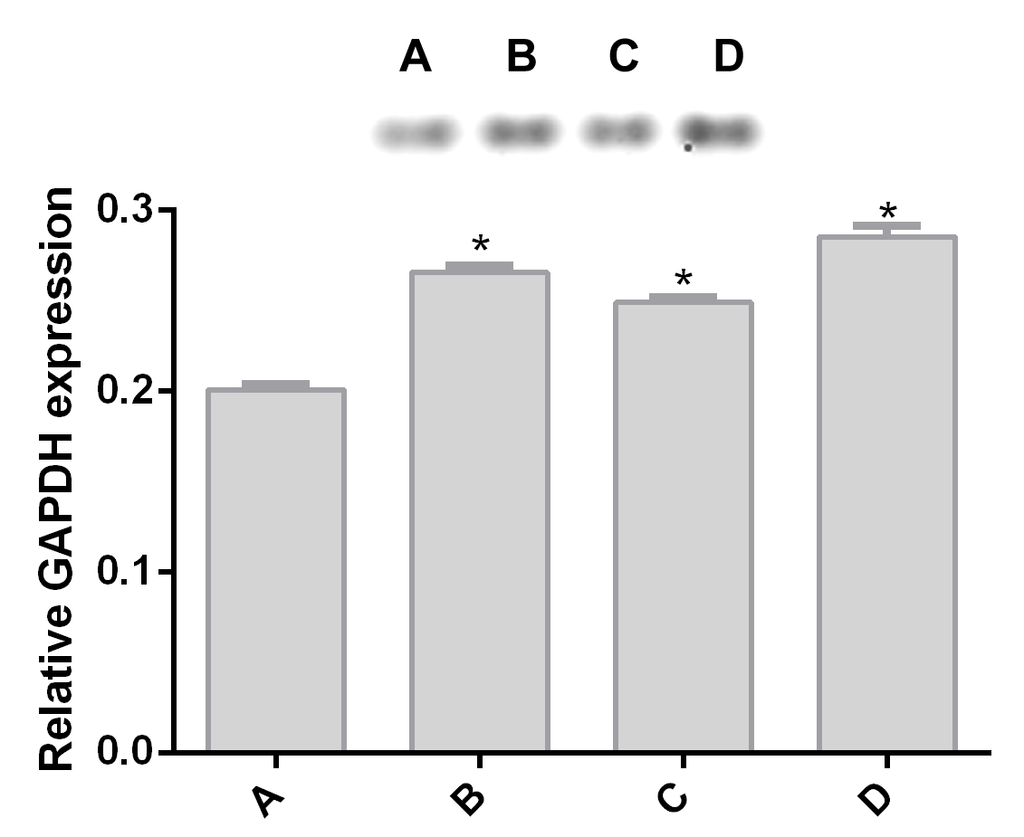 Image of western blotting (shown above) and densitometric analysis of (A) DMSO, (B) 150 µg/mL, (C) 175 µg/mL, and (D) 200 µg/mL treated cells. Data analyzed with GraphPad 6 software, *p ≤ 0.0001.Tubulin distribution of G. lamblia was affected by pomegranate peel extract