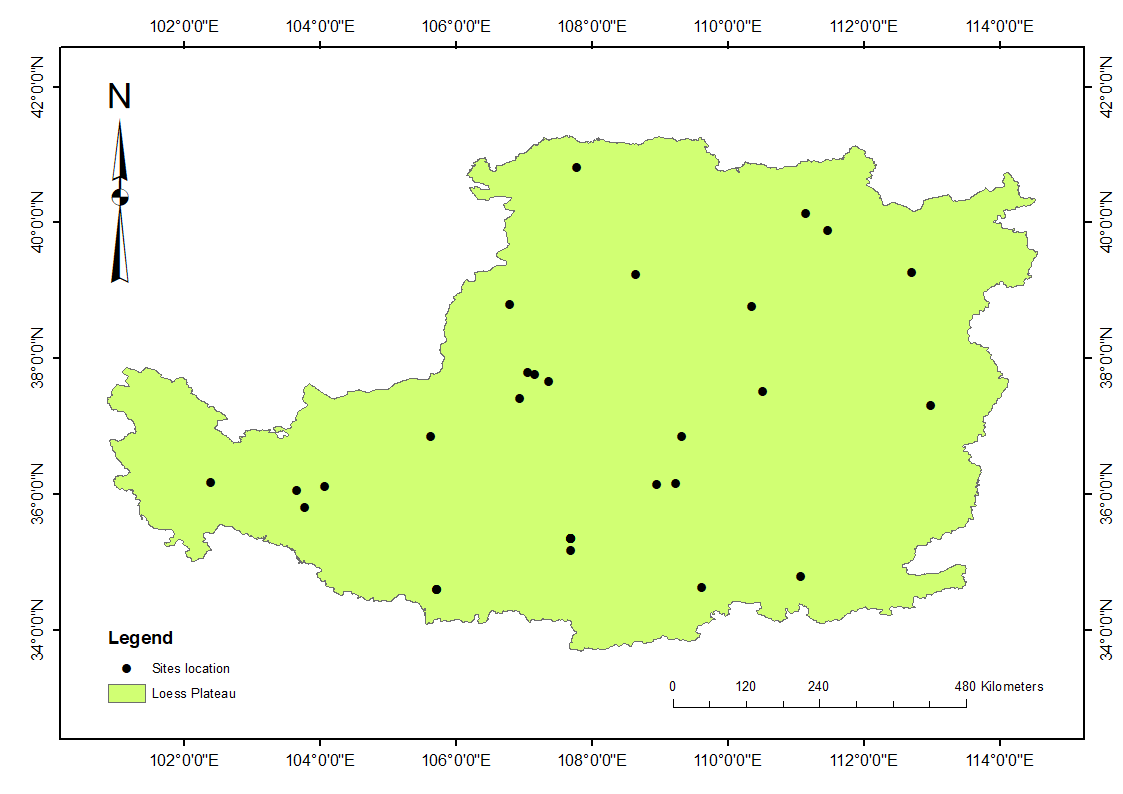 The Loess Plateau (LP) is located in central China, between 33°43′7″–41°16′7″N and 100°54′ 7″–114°33′ 7″E on the upper and middle reaches of the Yellow River (Fig. S1). The Loess Plateau is located in the middle reaches of the Yellow River Basin, which covers an area of 640,000 km2 and includes seven administrative provinces (specifically, Gansu, Inner Mongolia, Ningxia, Qinghai, Shaanxi, Shanxi, and Henan). The average annual precipitation ranges from 144 mm in the north to 790 mm in the south, with the majority falling between June and September (Jiang, Zhang & Zhang, 2018). The average annual temperature ranges from 6 to 14 °C. The soil is primarily loess and rich in nutrients, making it suitable for agricultural production and the majority of soil texture ranges from fine silt to silt, making it prone to erosion (Geng et al., 2020).