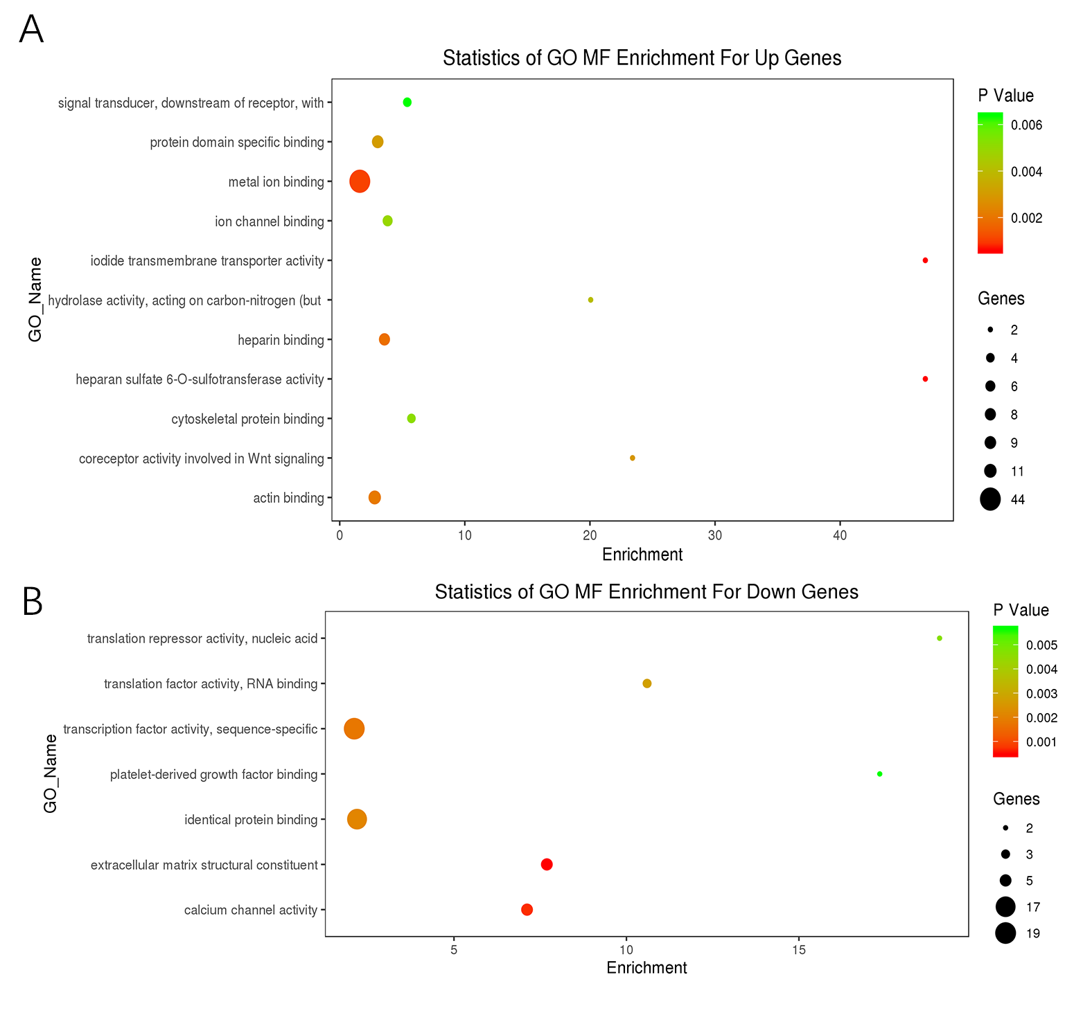 Statistics of GO molecular function (MF) enrichment results for up-regulated and down-regulated genes with overexpression of BZRAP1-AS1