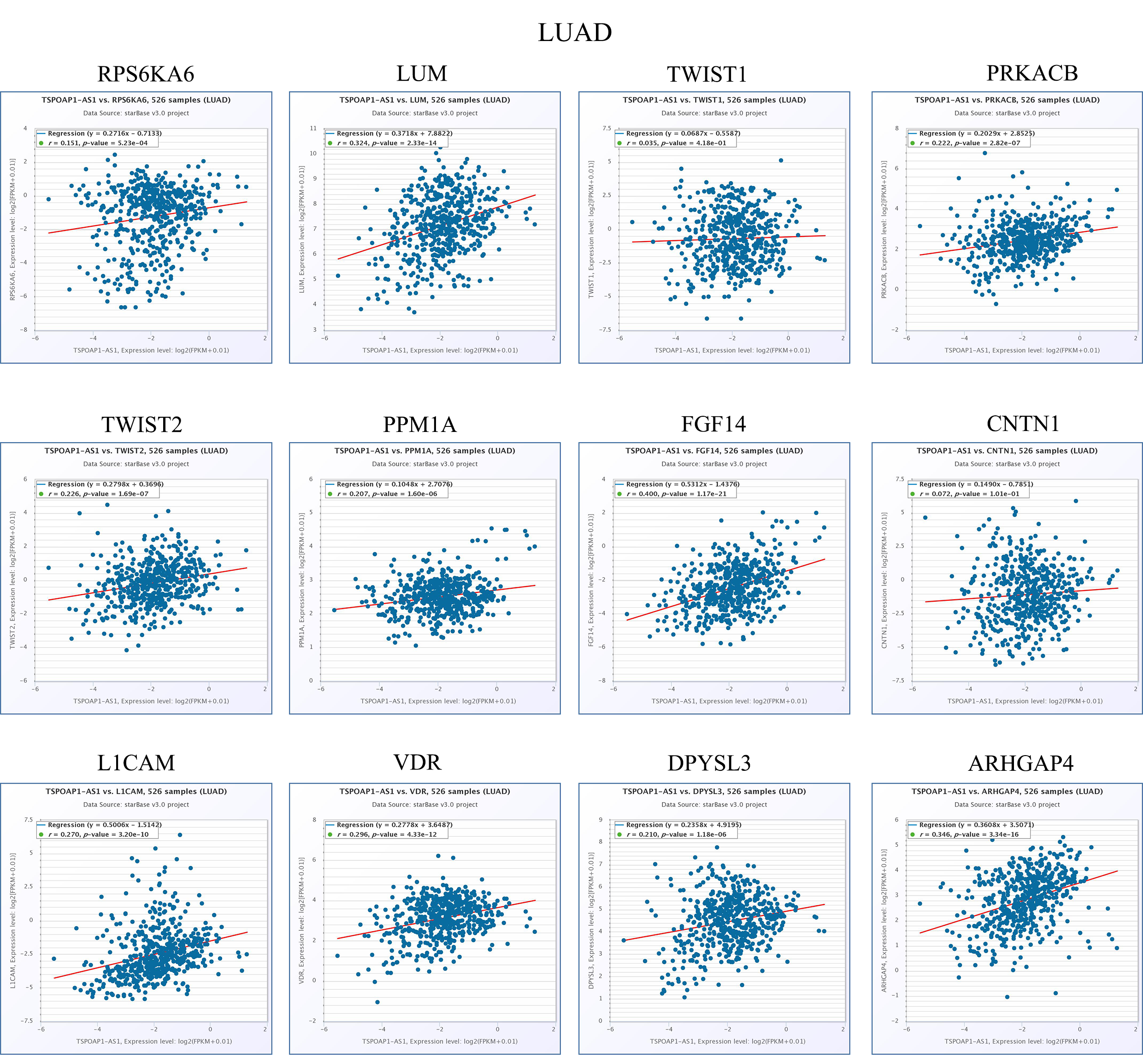 Co-expression analysis in LUAD for BZRAP1-AS1 and twelve predicted target genes RPS6KA6, LUM, TWIST1, PRKACB, TWIST2, PPM1A, FGF14, CNTN1, L1CAM, VDR, DPYSL3, ARHGAP4