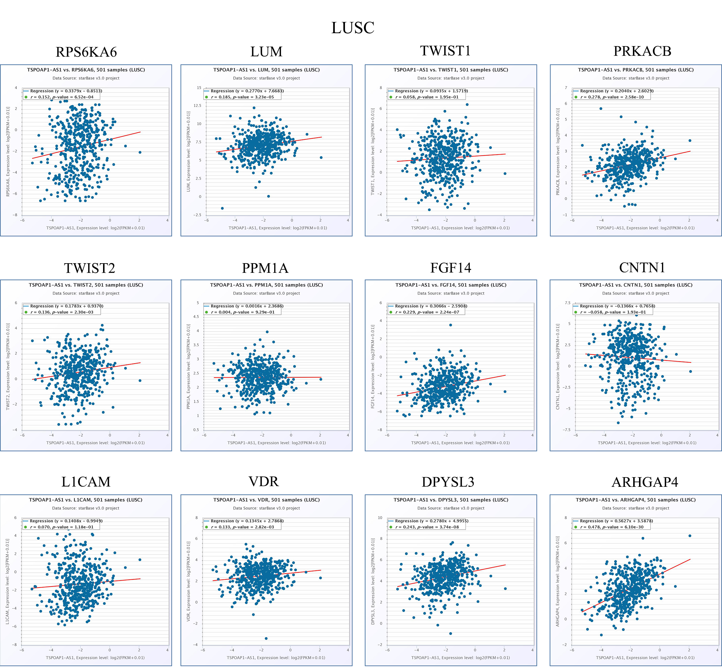 Co-expression analysis in LUSC for BZRAP1-AS1 and twelve predicted target genes RPS6KA6, LUM, TWIST1, PRKACB, TWIST2, PPM1A, FGF14, CNTN1, L1CAM, VDR, DPYSL3, ARHGAP4