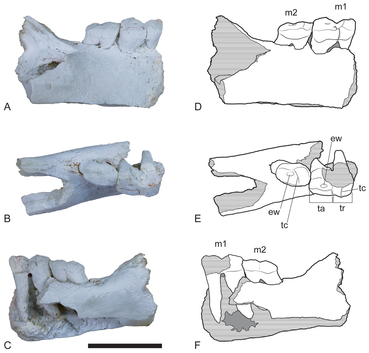 (A) Buccal view. (B) Occlusal view. (C) Lingual view. (D–F) Interpretive line drawings of (A–C) respectively. Note that specimen in (A–C) has been whitened with ammonium chloride. Abbreviations: ew, remnant enamel well; m1, first lower molar; m2, second lower molar; ta, talonid; tc, transverse crest; tr, trigonid. Scale bar = 20 mm.During the 2013 field season a new pit was opened at Alcoota, on the same stratigraphic level as the other pits that quarry the Alcoota Local Fauna. This new pit, named ‘Shattered Dreams’, proved to be exceptionally densely packed with fragmented bones, interspersed with occasional complete, or near complete specimens. Not only was the volume of fossil bone extraordinarily high but so was the diversity, with virtually all known taxa from the Alcoota Local Fauna recovered from an area of less than two square meters. Included among these was a dentary belonging to W. alcootaensis (Figs. 3–5). This is the first substantial cranial specimen of this species found since the holotype was recovered 39 years previously. W. alcootaensis is now known from all of the main quarries of the Alcoota Local Fauna.