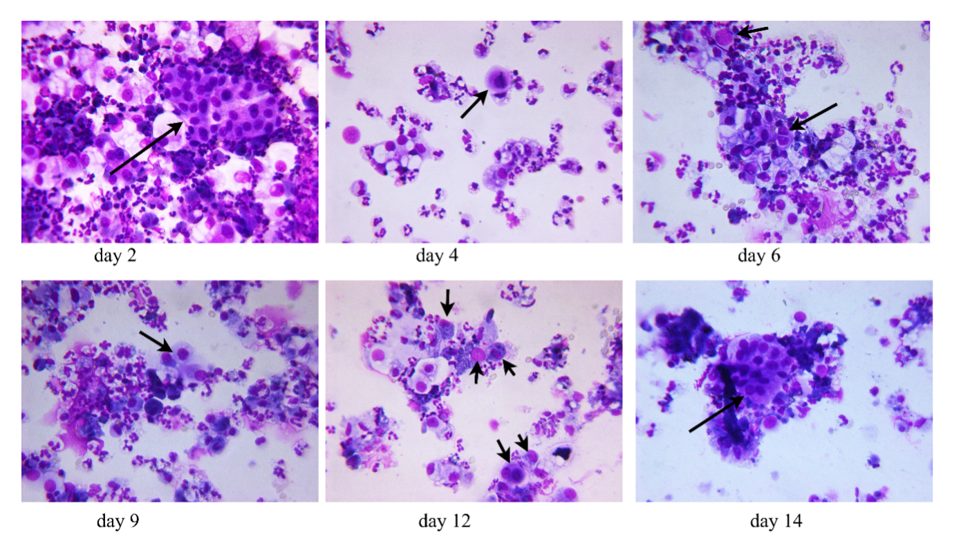 Cytospin preparations of morning urine sediment from a patient undergoing toxin-induced AKI stage 3.
