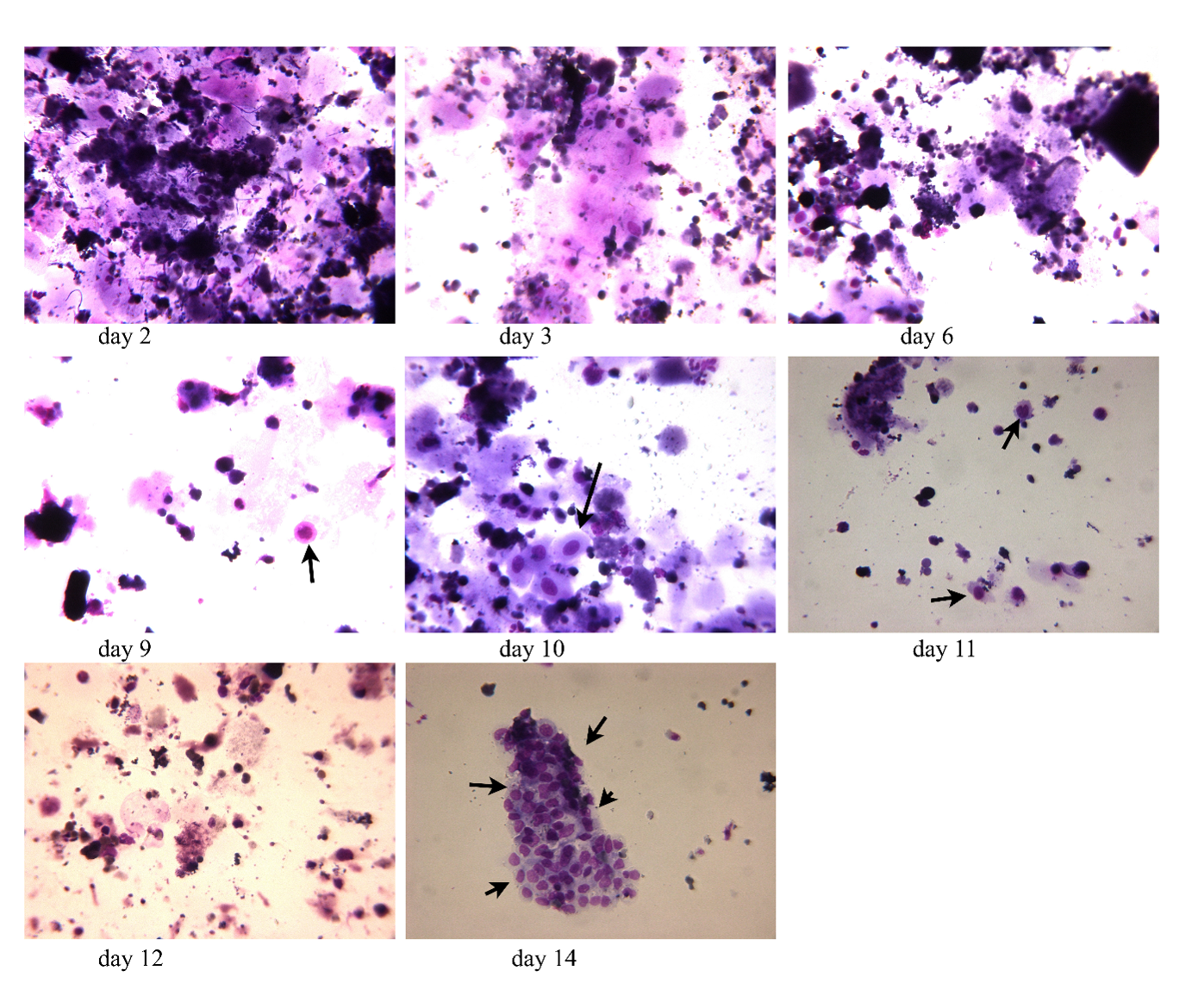 Seven to eight ml morning urine were centrifuged and the resultant pellet was resuspended in three ml tissue culture medium, 100µl were used to generate one cytopreparation. Following airdrying the slides were stained using routine H/E-staining. The arrow indicates hyperplastic epithelial clusters or cells with disproportionate cytoplasmic nuclear ratio.