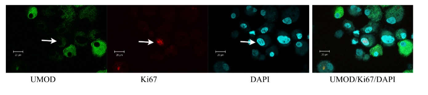 These maintained nuclear staining for Ki67 und showed UMOD staining to some degree. The nucleus is still disproportionate in size and directs towards the mitotic phase.