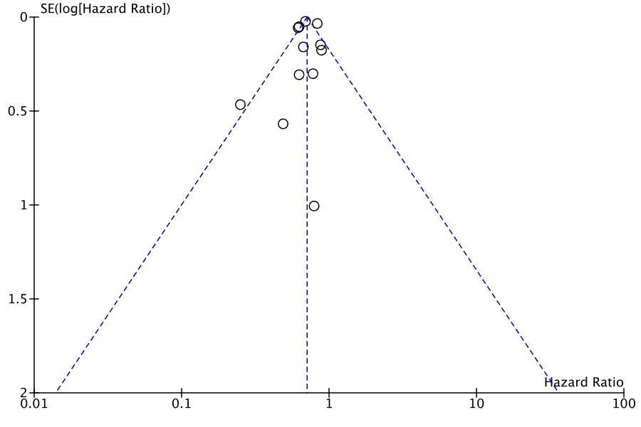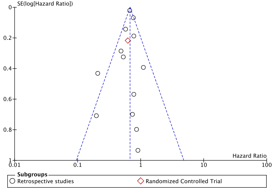 The quantitative data were exported to Review Manager 5.4 and pooled in a meta-analysis only if appropriate. We used the inverse variance method to obtain the pooled HR. Studies were considered to have moderate heterogeneity if I2 >30%, substantial heterogeneity if I2 >50%, and considerable heterogeneity if I2 >75% (Higgins et al., 2021). Sources of heterogeneity were assessed for any studies with substantial heterogeneity or more. To detect any risk of publication bias, we constructed funnel plots in Review Manager 5.4 and performed Egger’s Test in Stata 17. Symmetrical funnel plots indicated low risk of publication bias. The studies were considered to have potential risk of publication bias if p-value on Egger’s Test is less than 0.05.