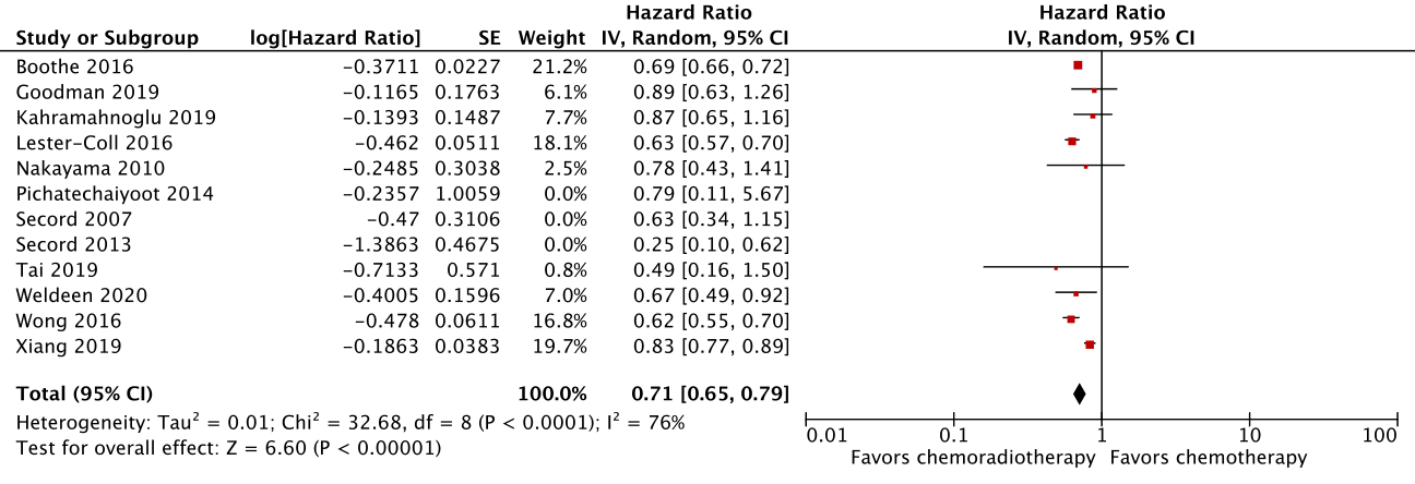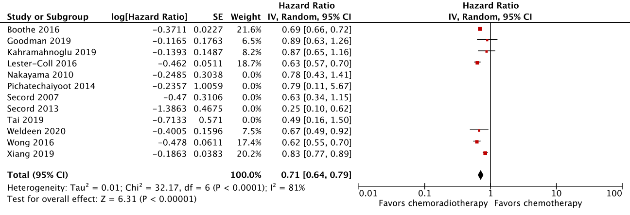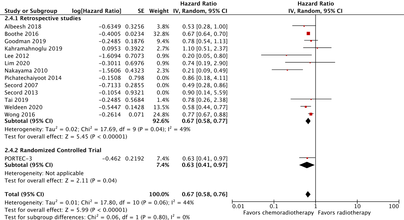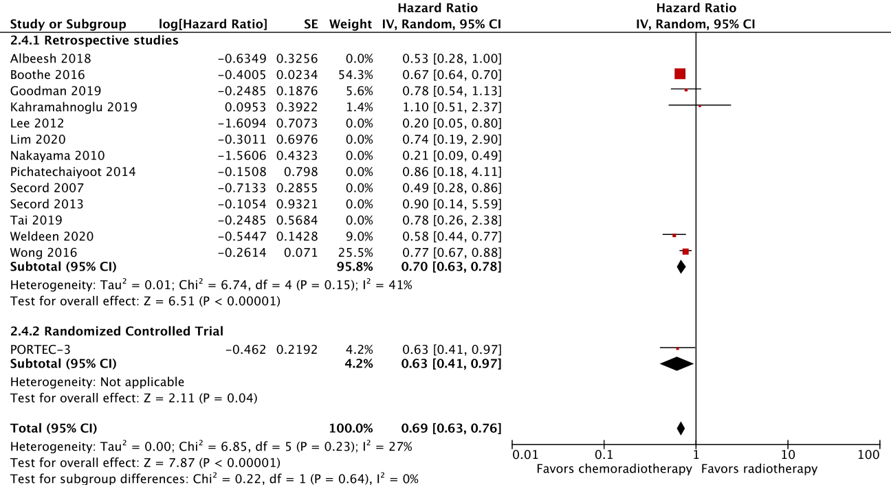 A total of 17 articles with 23,975 patients in the CRT vs RT group and 50,502 patients in the CRT vs CT group were included. The OS Hazard Ratios (HR) of CRT compared to RT was 0.66 (95% CI [0.59–0.75]; P < 0.00001). Compared to CT, the OS HR was 0.70 (95% CI [0.64–0.78]; P < 0.00001). CRT also significantly improved the DFS compared to CT only (HR 0.79, 95% CI [0.64–0.97]; P = 0.02) However, CRT did not improve the DFS compared to RT only, with HR of 0.71 (95% CI [0.46–1.09]; P = 0.12).