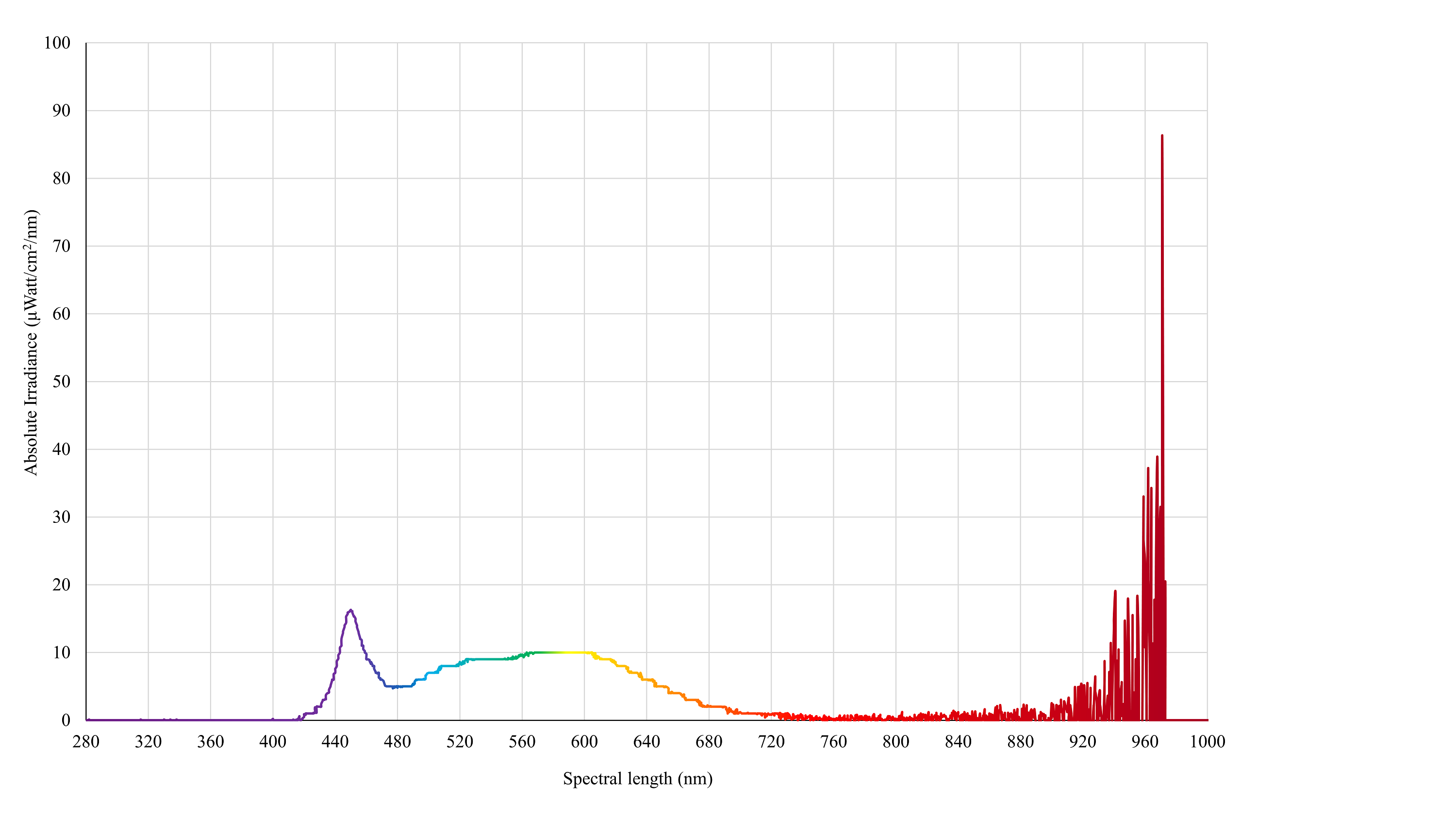 Spectral irradiance of 3 × LED Filament Warm-white lights (Edison Screw LED GLS Filament Globe, E27-4W, Mirabella, Victoria, Australia) as measured by an Ocean Insight Flame-S-XR1 Spectroradiometer at chicken eye height (30 cm from the floor).