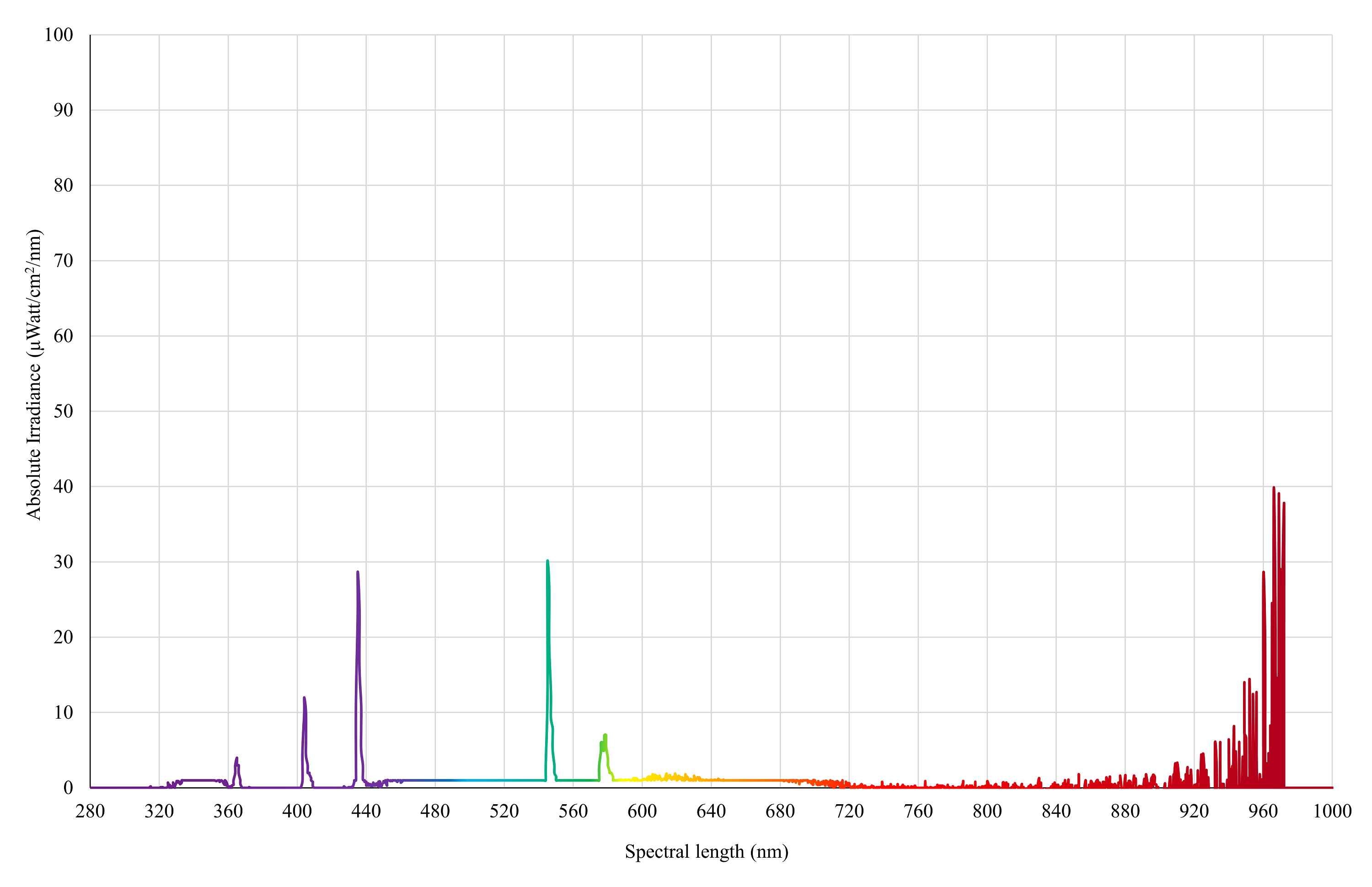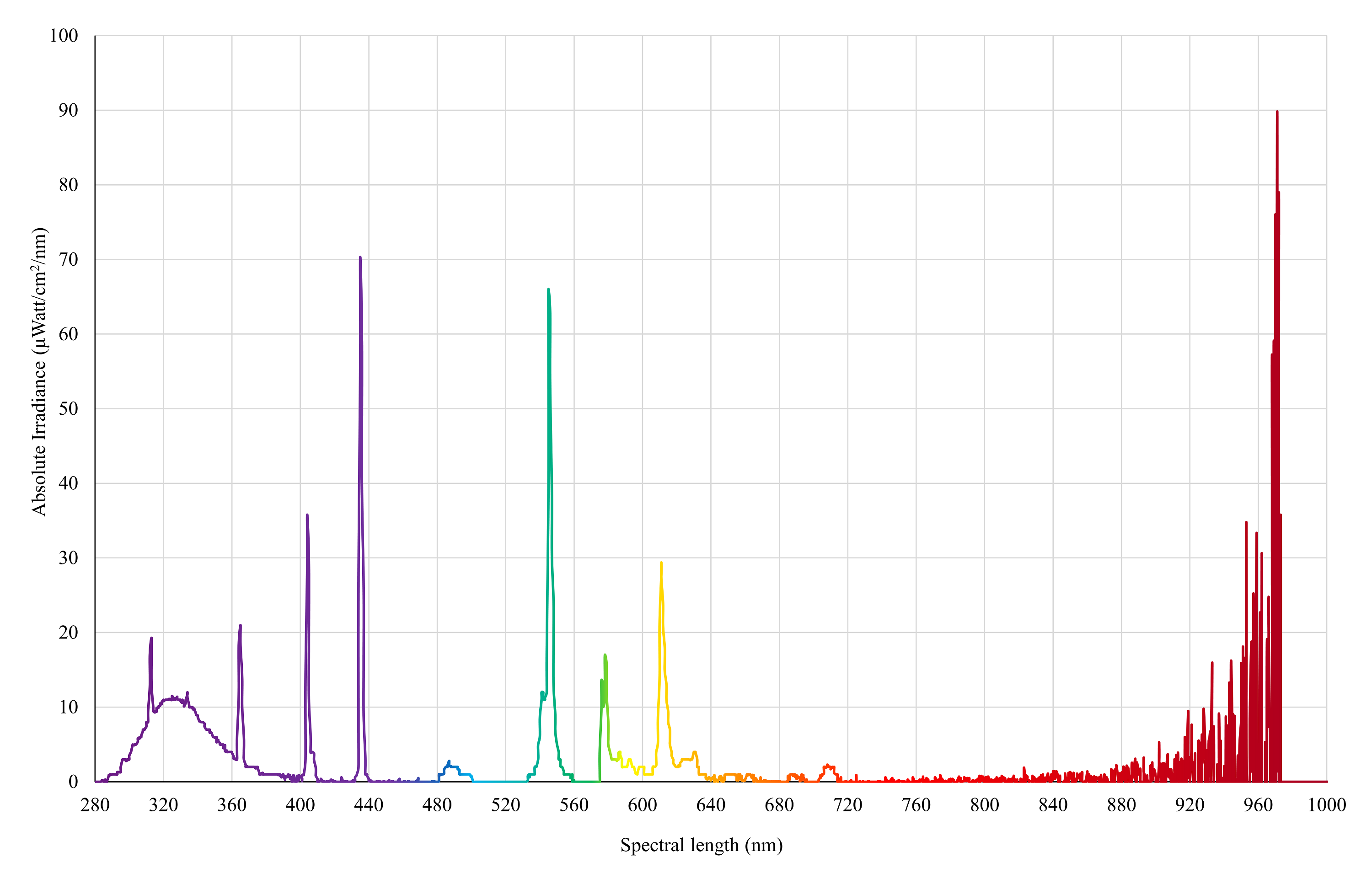 Spectral irradiance of 3 × PureSun Compact Bird Lamps (E27-20W, Arcadia, Germany) with 3-mm glass placed under the bulbs to block UVB spectrum as measured by an Ocean Insight Flame-S-XR1 Spectroradiometer at chicken eye height (30 cm from the floor).