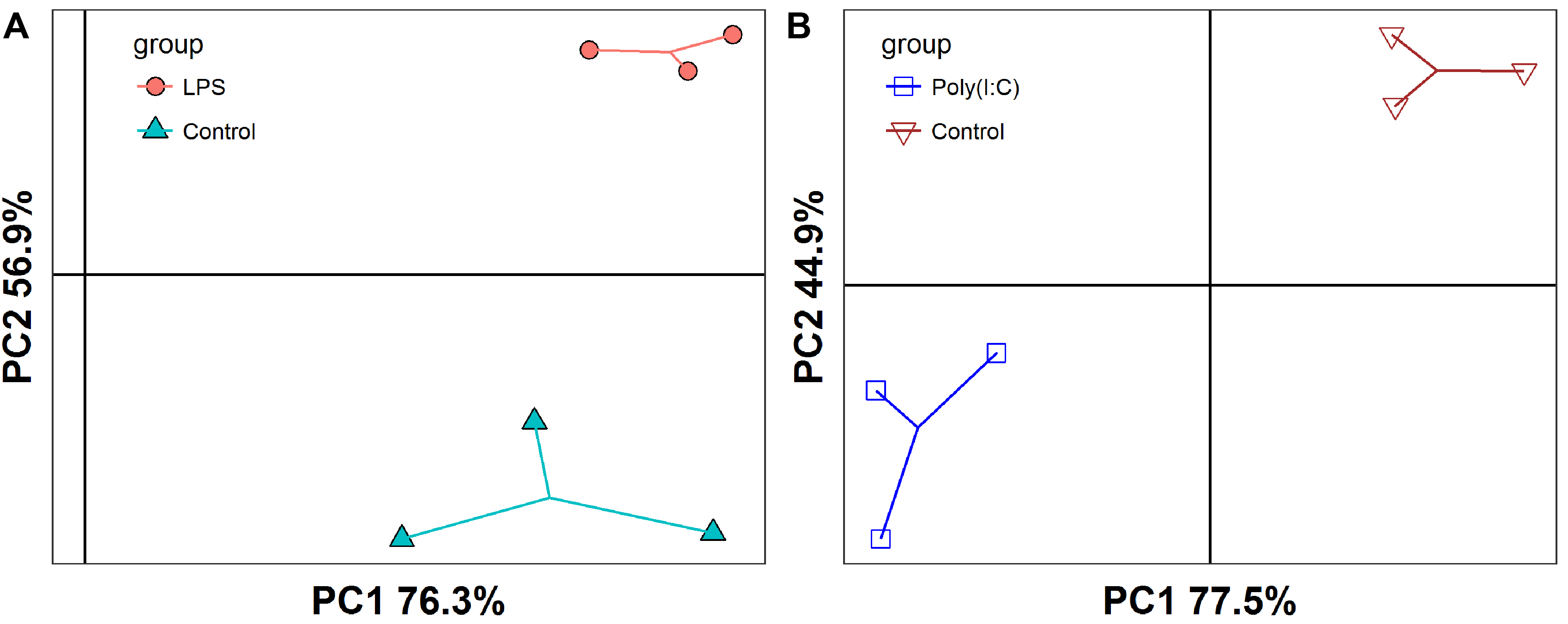 As shown in Table 2, after removing low quality reads and adapters, a total of 203.88 million and 183.47 million clean reads were obtained from the LPS and poly(I:C) exposure experiments. An average of 36.08 million, 31.87 million, 31.77 million, and 29.38 million clean reads were obtained from cDNA libraries of the LPS exposure group, LPS control group, poly(I:C) exposure group, and poly(I:C) control group, respectively. Quality assessment of the sequencing data showed that the Q30 value of each group was over 94%. The GC and AT contents of each group were almost equal. Then, clean reads were aligned to the reference genome GRch38 by HISAT2. A total of 192.48 million and 173.90 million clean reads from LPS and poly(I:C) exposure experiments were successfully mapped, with 185.79 million and 168.28 million were uniquely mapped. Both the mapping efficiency and uniquely mapped efficiency of each group were more than 90%. These results indicated that the sequencing data were high quality and reliable, and could be used for subsequent analysis.
