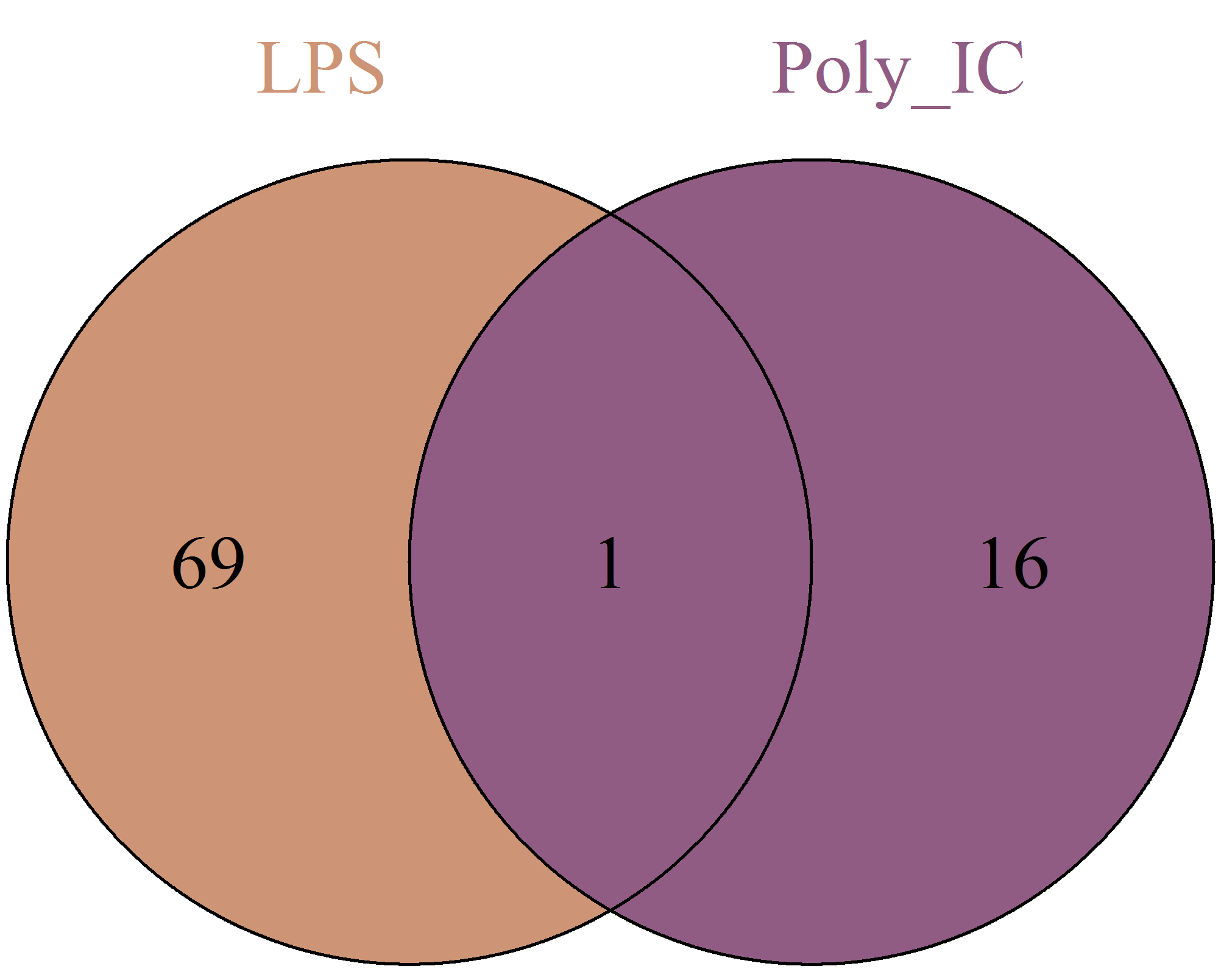 In conclusion, we identified 70 and 17 DEGs involved in the specific responses of Caco-2 cells to LPS and ploy(I:C) simulation, respectively. Importantly, several DEGs related to immune regulation, inflammatory responses, and viral replication were verified. Our findings provid a basis for comprehensive understanding of the mechanisms that intestinal epithelial cells employ to defend against invading pathogens, which would be beneficial for developing prevention and treatment strategies for gut bacterial and viral diseases of farm animals.