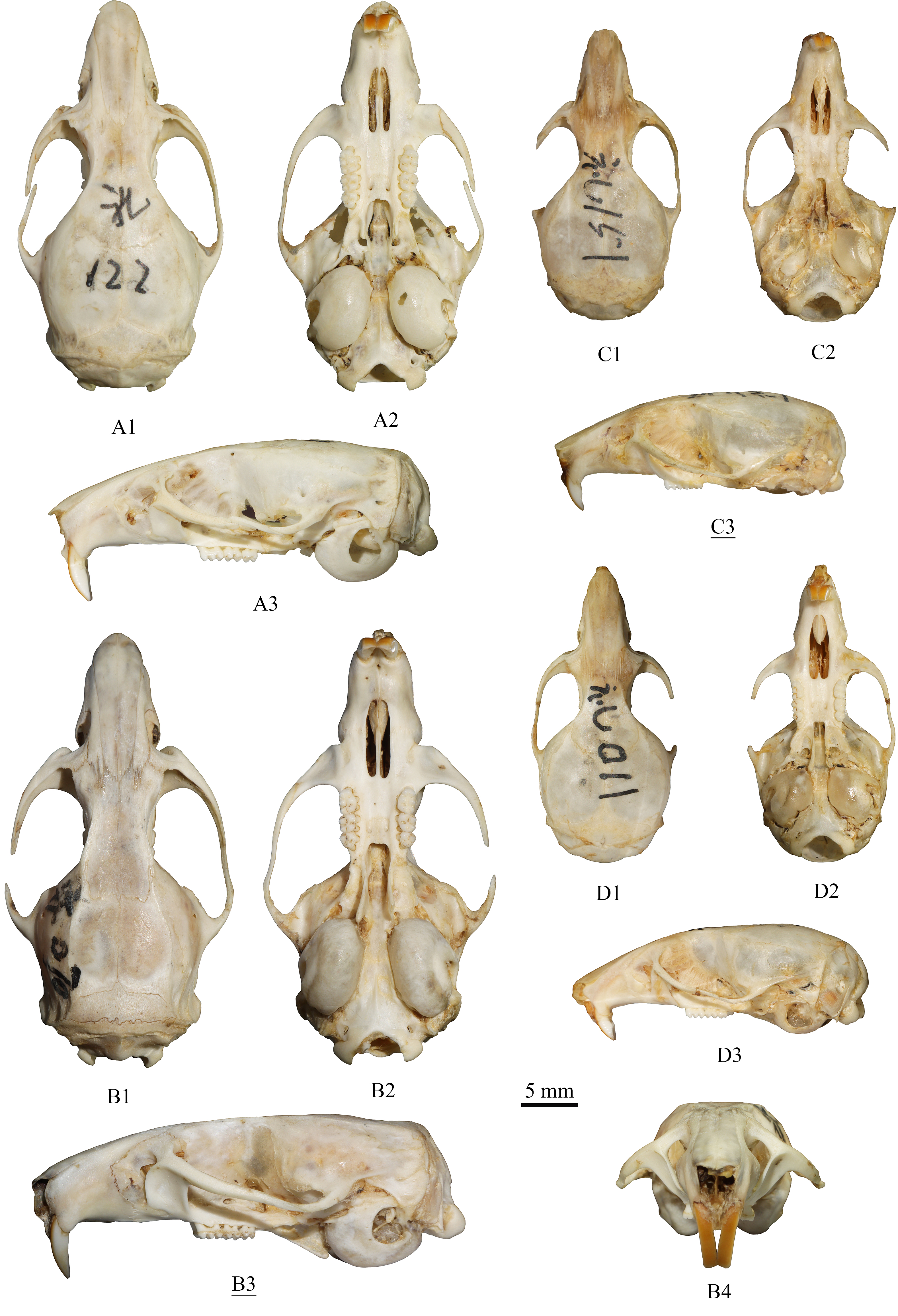 (A) Tscherskia triton, catalogue number: 礼122; (B) Tscherskia triton, catalogue number: 齐070; (C) Cricetulus barabensis, catalogue number: 礼151; (D) Cricetulus longicaudatus, catalogue number: 礼011. (A1), (B1), (C1), (D1), dorsal view; (A2), (B2), (C2), (D2), ventral view; (A3), (B3), (C3), (D3), lateral view; (B4), anterior view. The underlined label indicates the image has been reversed.