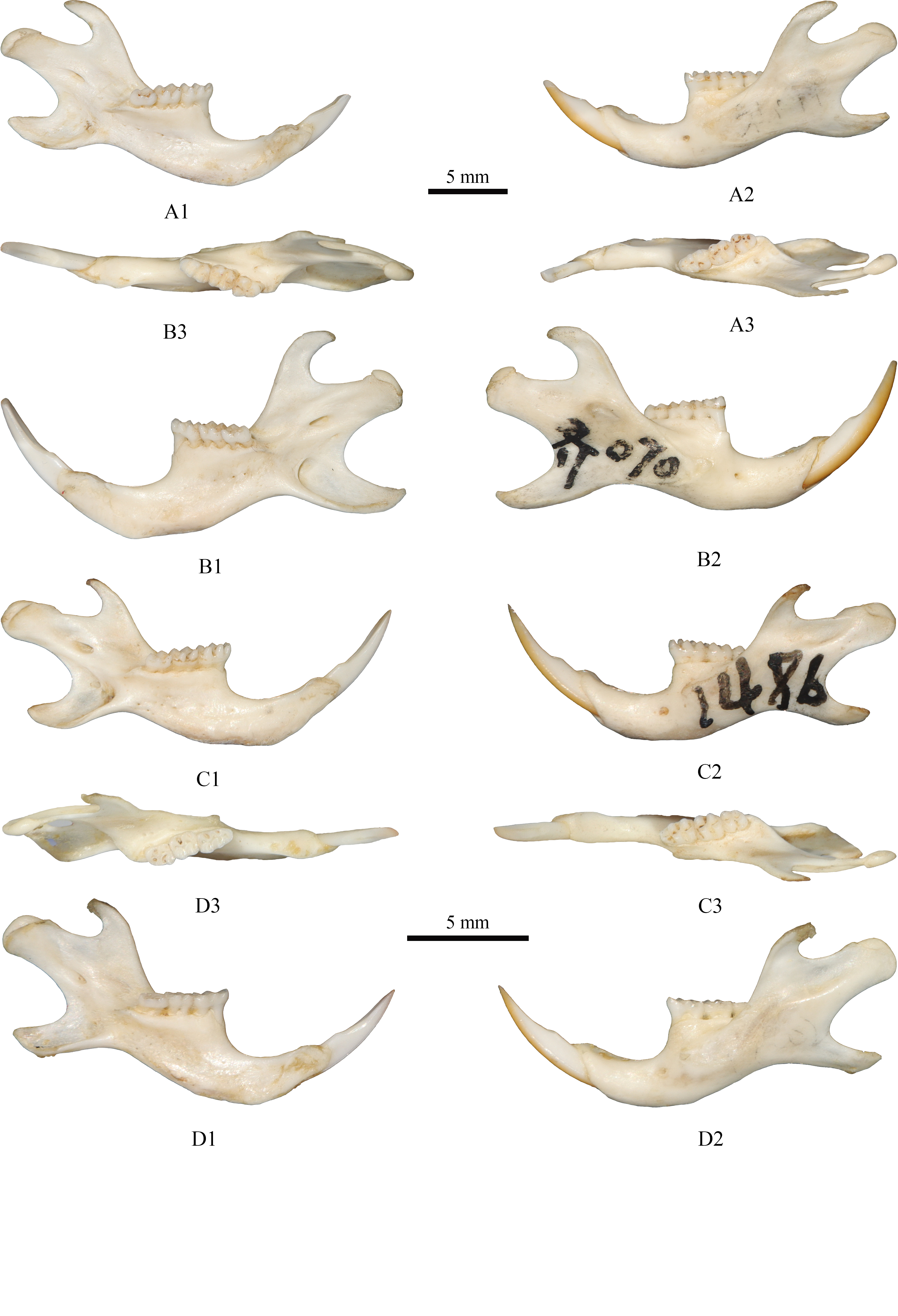 (A) Tscherskia triton, left mandible, catalogue number: 礼094; (B) Tscherskia triton, right mandible, catalogue number: 齐070; (C) Cricetulus barabensis, left mandible, catalogue number: 148b; (D) Cricetulus longicaudatus, left mandible, catalogue number: 瓦002. (A1), (B1), (C1), (D1), lingual view; (A2), (B2), (C2), (D2), buccal view; (A3), (B3), (C3), (D3), occlusal view. (A) and (B) share one scale bar; (C) and (D) share one scale bar.