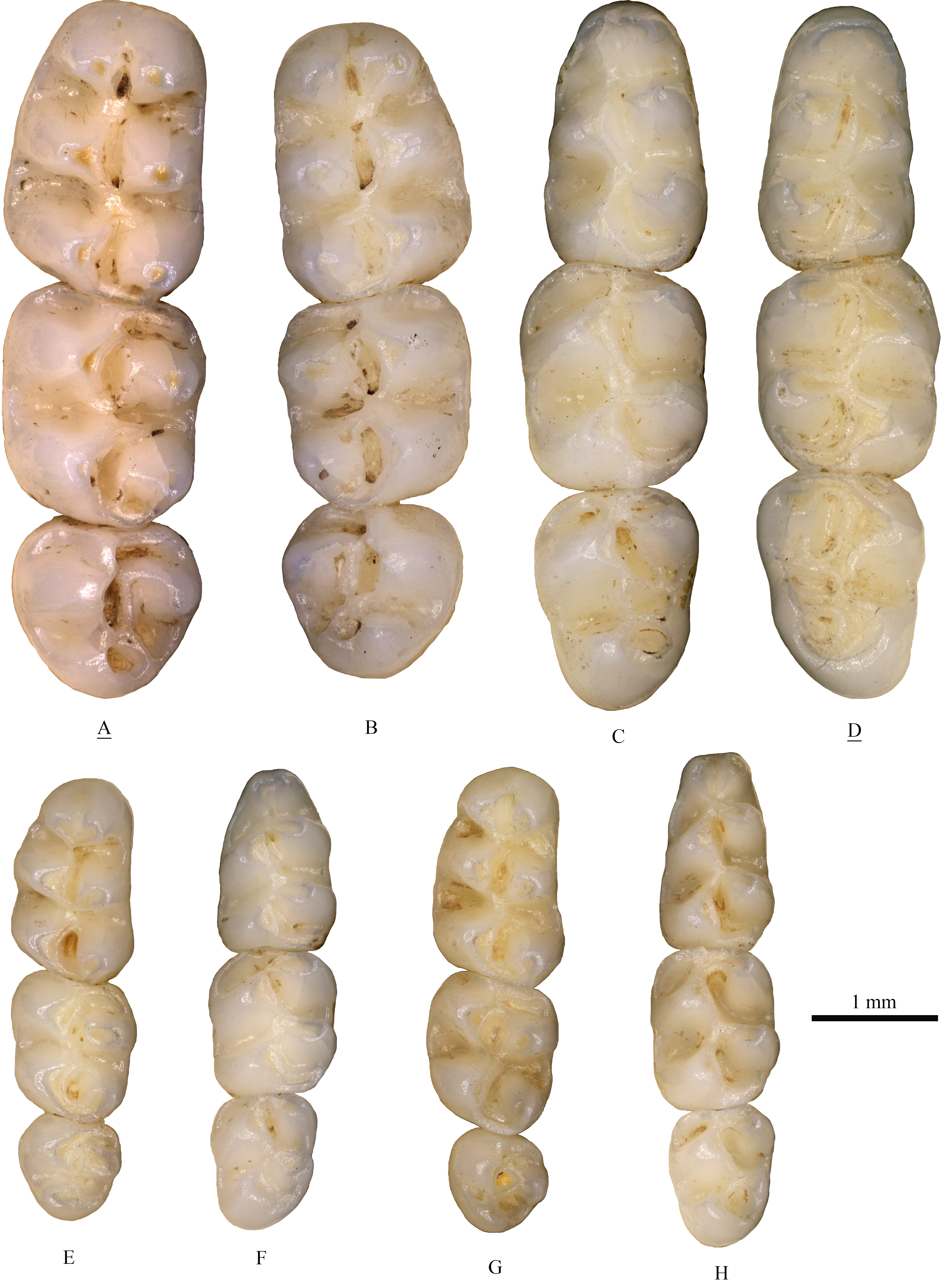 In a hamster individual, the molars symmetrically distributed in the oral cavity (e.g., the left and right M3) may exhibit minor morphological differences; therefore, the morphological structures of both the left and right molars of large-sized hamsters from Syz 2 and living T. triton were statistically analyzed in the present study. The material of C. varians used for comparison here is mainly from Zhoukoudian (Zheng, 1984a) and Jinniushan (Zheng & Han, 1993).