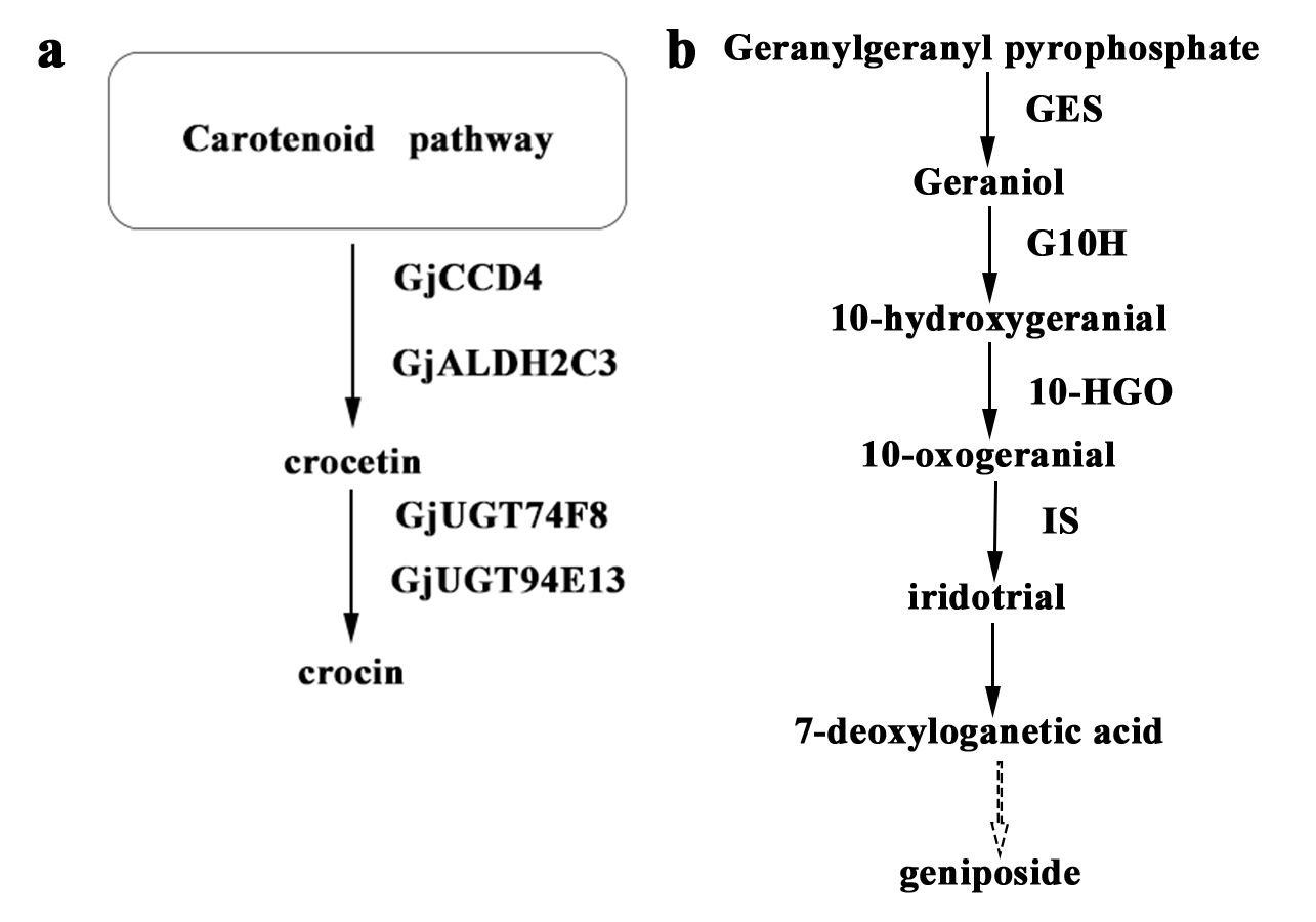 a. Carotenoid biosynthesis pathway. b. Geniposide biosynthesis pathway