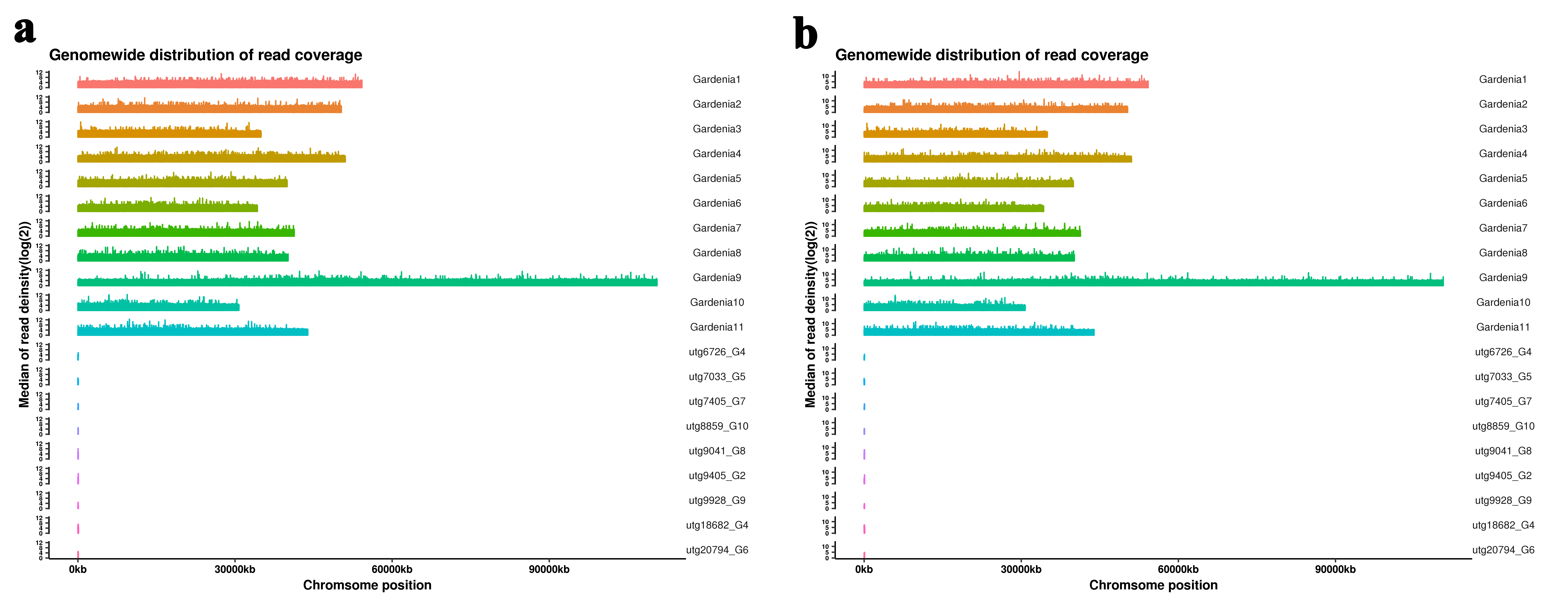 Note: The abscissa is the chromosome position, and the ordinate is the value obtained by logarithm (log2) of the coverage depth of the corresponding position on the chromosome. a.the sample of FD,b.the sample of YP1