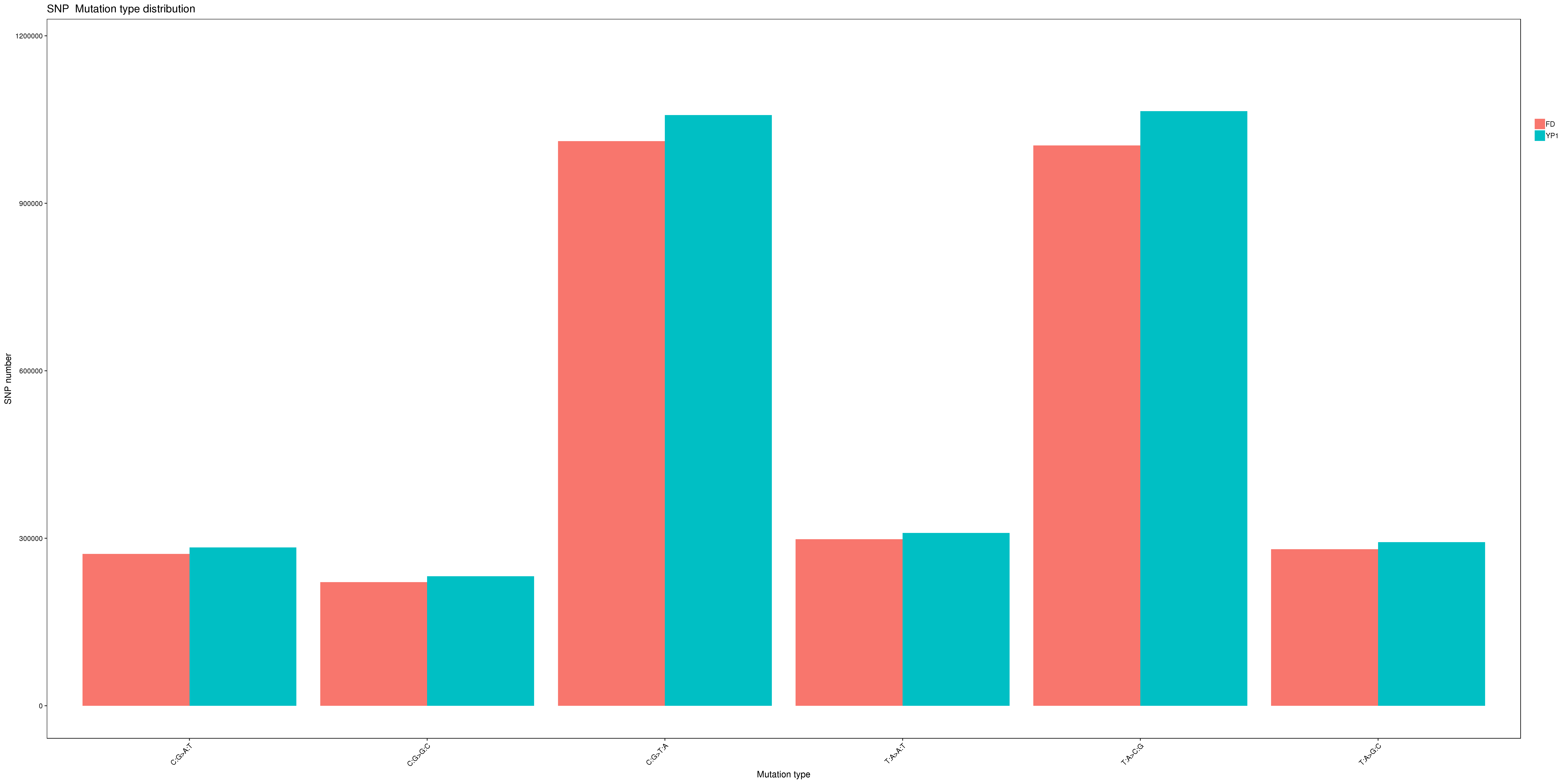In this study, a total of 39,406,575 clean reads were obtained from one wild and cultivated species, and the average depth of each sample was 10X. A large number of variations such as SNP, InDel, SV and CNV were detected. Compared with other mutations, SNP and InDel have more abundant genetic variation and can better represent the genetic information of the whole genome of gardenia. SNP and InDel variation analysis have been widely used in the fields of population genetic structure, genetic diversity analysis and functional gene mining of non-model organisms (Chen et al., 2021; Giudice, Bazakos & Vassiliou, 2022). 3,087,176 SNP variants were detected in cultivar gardenia FD, and 3,241,416 SNP variants were detected in YP1. The same was true of the number of SNP variations in wild species YP1 than in cultivated species FD1, InDel. It can be seen that wild species YP1 has higher genetic diversity, and in different Brassica napus, it is also found that winter rape has higher genetic diversity because the density of SNP and InDel is higher than that of spring rape (Wu et al., 2019). The most abundant type of SNP variation in sample YP1 and FD was the transformation type, and there was almost no difference between the conversion type of FD and the subversion type of SNP and YP1, especially the SNP ratio of heterozygous type of YP1 was much higher than that of FD, which indicated that YP1 had higher heterozygosity than FD and had higher homology with gardenia material with reference genome, while the cultivated species FD had more homozygous SNP than wild species YP1. It is reported in different varieties of Camellia sinensis that the ratio of non-synonymous mutation to synonymous mutation of InDel variation is almost the same as that of long-term interspecific hybridization. It is inferred that to a large extent, these two samples and the reference genome of gardenia do not come from the same region (An et al., 2020). Transition (Ti) and transversion (Tv) are two types of SNP variants, and the proportion between them is related to the evolution of the species (Mursyidin et al., 2022), the proportion of Ti/Tv between the two samples is very close, which does not rule out the common origin and ancestor of cultivated species FD and wild species YP1. The number of the main mutation types of FD was also less than that of YP1, and the variations of the two samples were mainly concentrated in a large number of frame shift mutations in the intergenic region. Generally speaking, the variation of FD of cultivated species is relatively conservative, which has lost a lot of genetic diversity while having more stable quality, which is similar to the reported results of pear, cotton and wheat (Li et al., 2021a; Li et al., 2021b; Hussain et al., 2022).