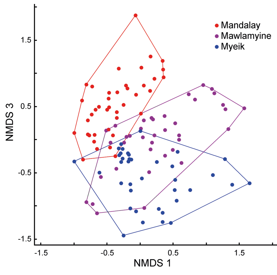 Figure 4: Non-metric multidimensional scaling (NMDS) ordination for Mandalay (A), Mawlamyine (B), and Myeik (C) in Myanmar.