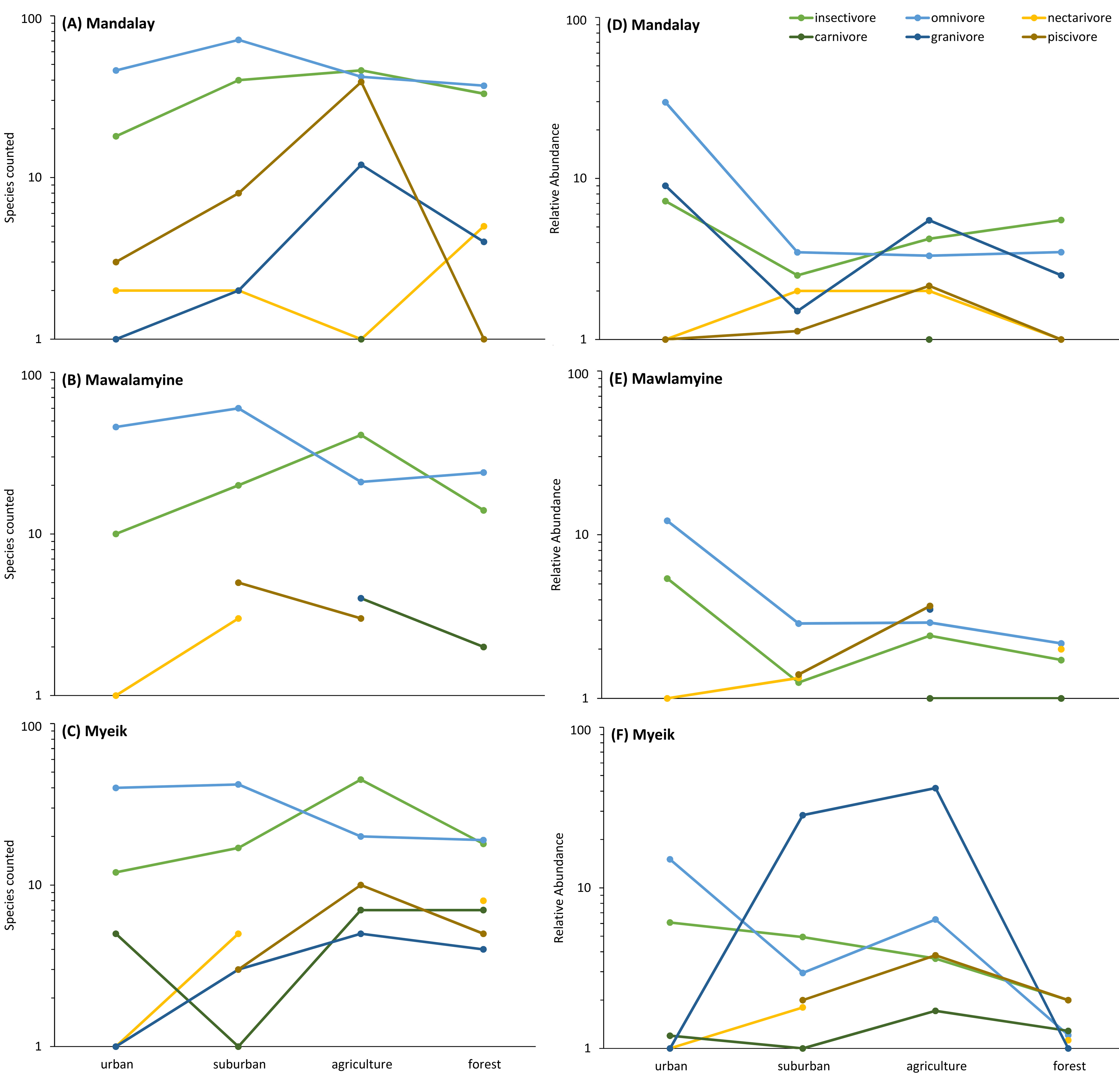 We analyzed bird species diversity and relative abundance along an urban to rural gradient in and around Mandalay, Mawlamyine, and Myeik, three large and locally important cities. We also assessed environmental factors that could potentially explain the changes in the bird community composition. We hypothesized: (1) Species diversity will decrease with increased human population density and increased proportion of hard surfaces, while relative abundance will increase with increasing urbanization. (2) Species composition will shift along the urban to rural gradient from specialists in rural areas to generalists in urban areas. Consequently, we expected at the city center (Downtown—urban) few generalist species with high abundance (i.e., omnivore species); outside the city centers (i.e., University Campus—suburban) and in agricultural/forested areas (Paddy Field—agriculture; Hill—forest) more specialized species. (3) Functional groups should vary along the urban to rural gradient with granivores and omnivores becoming dominant towards the urban downtown and decrease towards the periphery.