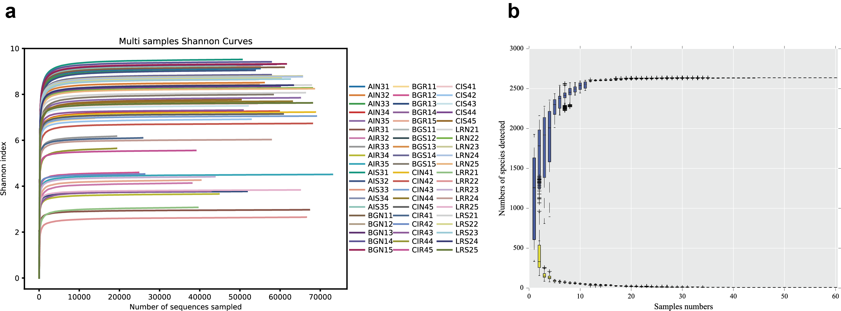 The root was homogenized in advance by bead beating for 1 min before the DNA isolation (Mini Beadbeater, Jingxin, and Shanghai). Root, rhizosphere, and non-rhizosphere soil (approximately 0.5 g) with five biological replicates used for DNA isolation. The total DNA for each sample was then isolated using the protocol of the MoBio PowerSoil® DNA isolation kit (Mo Bio Laboratories Inc, USA, catalog No. 12888-100) with slight modifications. Briefly, the kit mainly utilized a bind/wash/elute workflow. The test sample was treated with lysis buffer (Solution C1). Following a brief centrifugation at 10,000×g for 30 s, the resulting supernatant was carefully collected and transferred to a pristine two mL Collection Tube. To effectively eliminate impurities, repeated additions of Solution C2 were employed, with subsequent supernatant collection achieved through centrifugation. To ensure a robust binding of the DNA to the Spin Filter, Solution C4, characterized by high salinity, was introduced and thoroughly mixed with the supernatant. Subsequently, the resulting solution, comprising approximately 675 µL, was loaded onto the Spin Filter. This was accompanied by centrifugation at 10,000 x g for 1 min, with the process repeated three times to enhance the binding efficacy. Following this binding step, the Spin Filter underwent successive washes using Solution C5 (500 µL). Ultimately, the elution of the DNA of interest was achieved through two rounds of centrifugation at 10,000 x g for 30 s each, utilizing solution C6 (50 µL). The quality of DNA was determined by OD(260/280) and OD(260/230) ratios through a NanoDrop spectrophotometer.