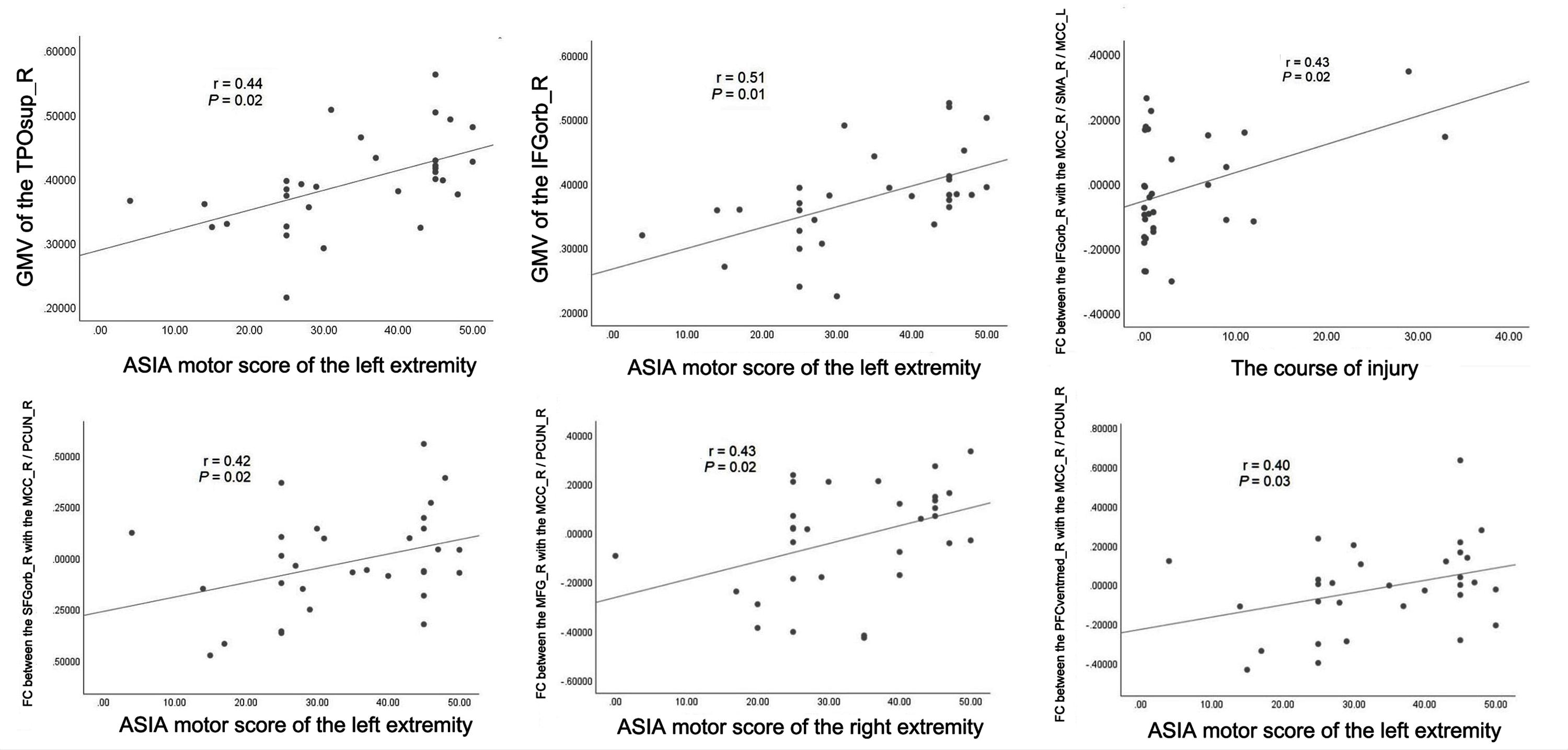 The ASIA motor score of the left extremity: (1) it had a moderate positive correlation with the GMV of the right TPOsup/the right IFGorb (r = 0.53, p < 0.01), as well as its sub-cluster right TPOsup (r = 0.44, p = 0.02) and the right IFGorb (r = 0.51, p = 0.01); (2) it had a moderate positive correlation with the FC between the sub-cluster right SFGorb with the right middle cingulate (MCC)/the right precuneus (r = 0.42, p = 0.02), and the FC between the sub-cluster right PFCventmed with the right MCC/the right precuneus (r = 0.40, p = 0.03), respectively; (3) it had a weak positive correlation with the GMV of the right SFGorb/the right SFG/the right MFG/the right PFCventmed (r = 0.38, p = 0.04).